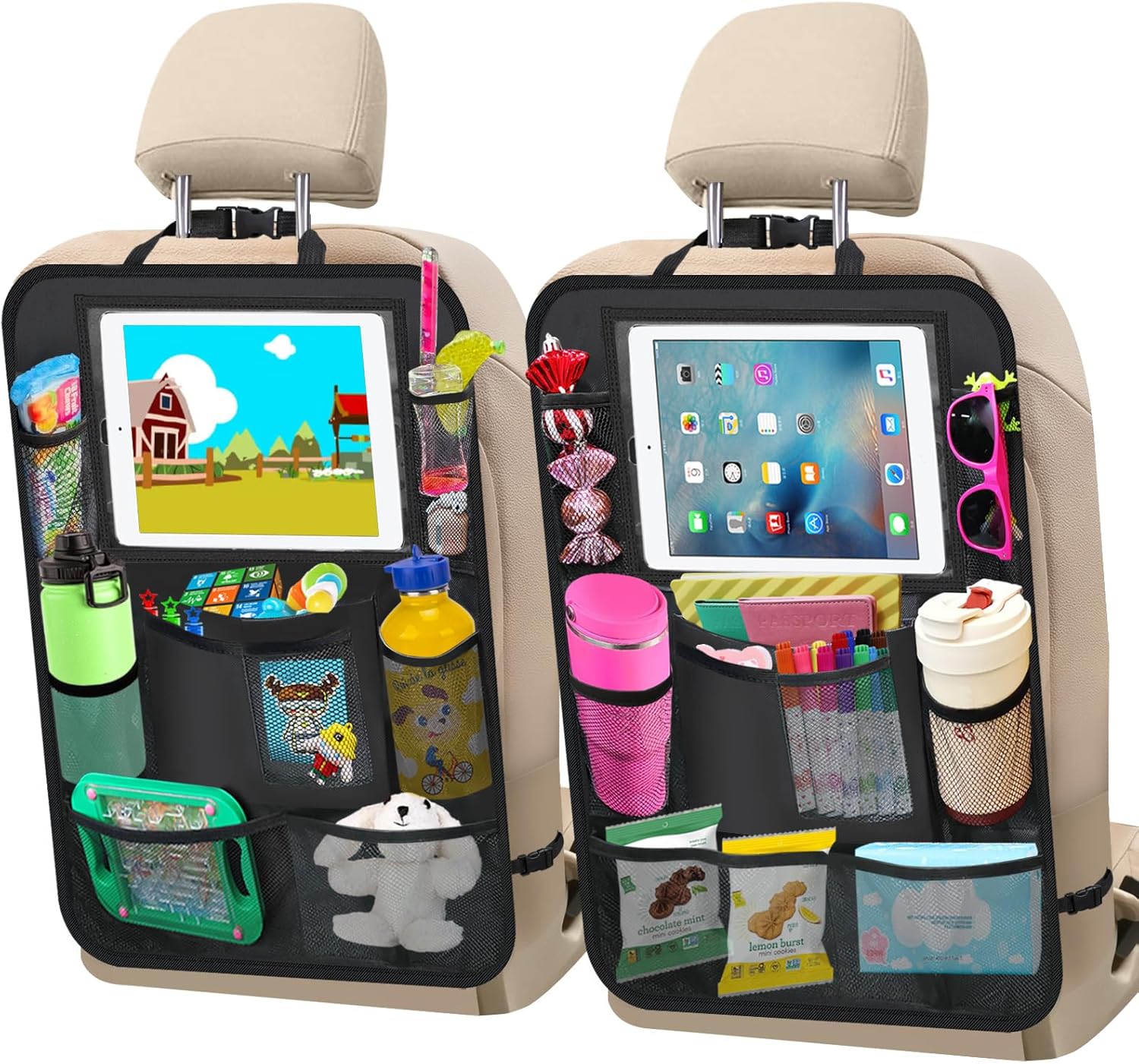 The car seat organizer featuring a clear tablet holder made with highly-durable plastic, your device’s screen will remain easily accessible, that your kids stay happy and occupied during the journey