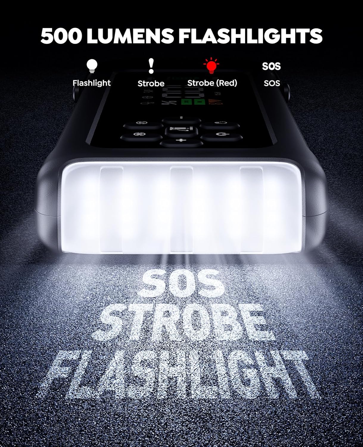 【EMERGENCY 500LM LIGHTS & COMFORTABLE HANDLE】The jump starter power pack is featured with 500 lumens WIDE lights that is significantly brighter by more than 400%, providing 4-mode lights for different cases. SOS draws attention to a rescue when emergencies. White flashlight ensures vital visibility after dark, easy for read maps, make repairs, or inflate and change tires.White strobe can deter potential threats, red strobe doubles as warning triangle during roadside emergencies.