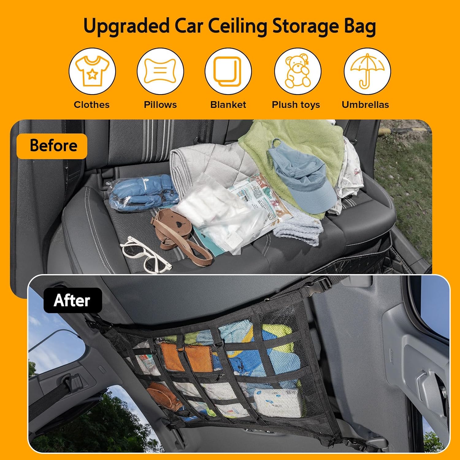 【Road Trip & Camping Essential】this car overhead mesh organizer keeps your items secure and accessible during car camping, long road trips, or daily commutes