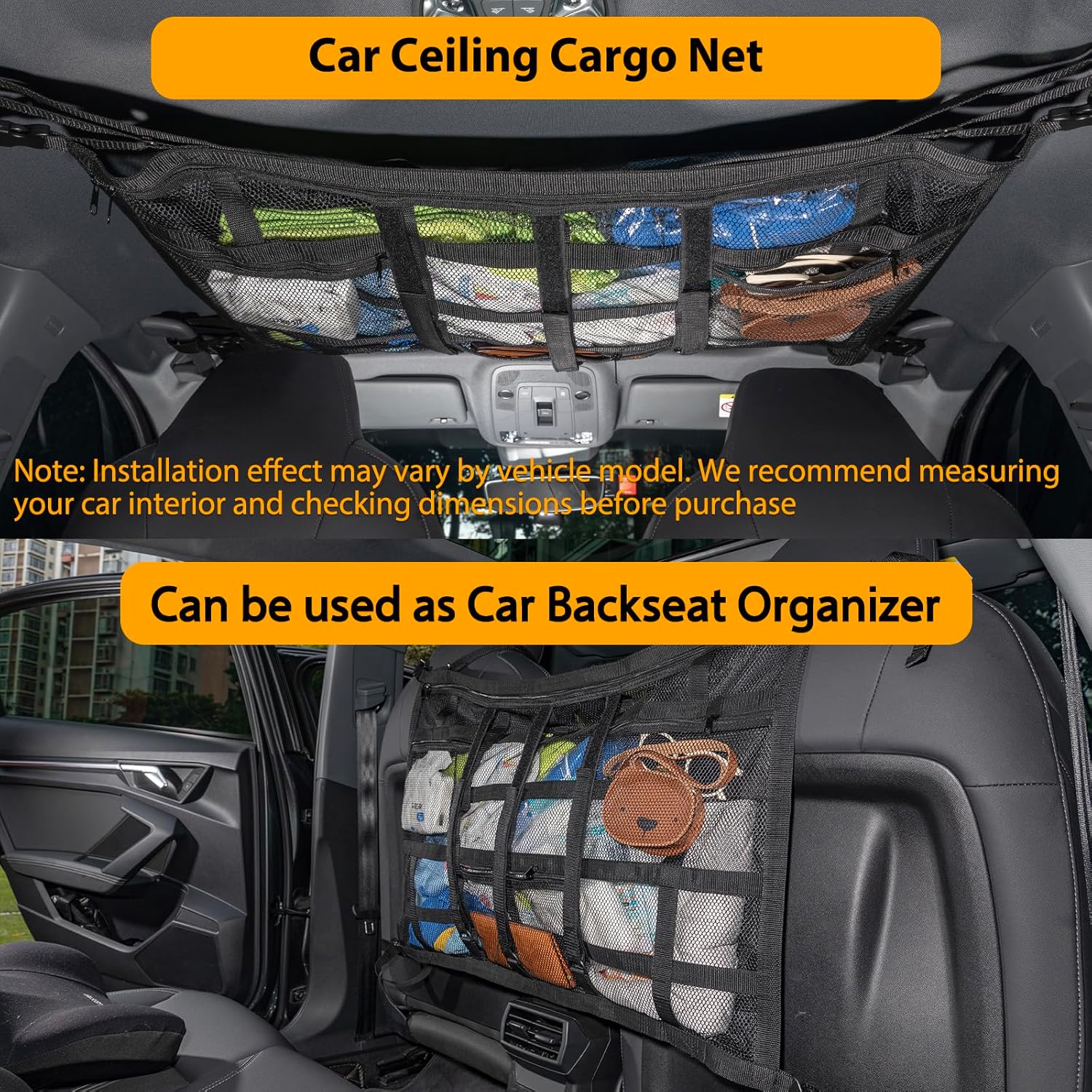 【Adding Storage Space Quickly for SUVs and Vans】 The fixing rope of the car mesh organizer is lengthened to 25.98inch/66CM,size is 31.5×21.6 inches,it is suitable for most SUVs and mini vans.It is perfect for vehicles like Ford,Jeep,Chevrolet,etc.Ideal for long road trips and overlanding gear car camping.Note: Installation effect may vary by vehicle model. We recommend measuring your car interior and checking dimensions before purchase