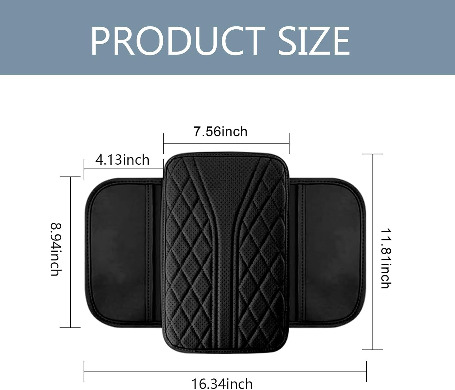 Overall dimensions of the armrest pad: 11.81 x 7.56 inchesSide pocket dimensions: 8.94 x 4.13 inchesThickness: 0.24 inchesNOTE: Due to the style and size of the armrest box for each vehicle model are different, we recommend that you confirm the appearance and size of the armrest box before purchasing to ensure that its size are similar to those of our product, avoid incompatibility affecting your shopping experience.