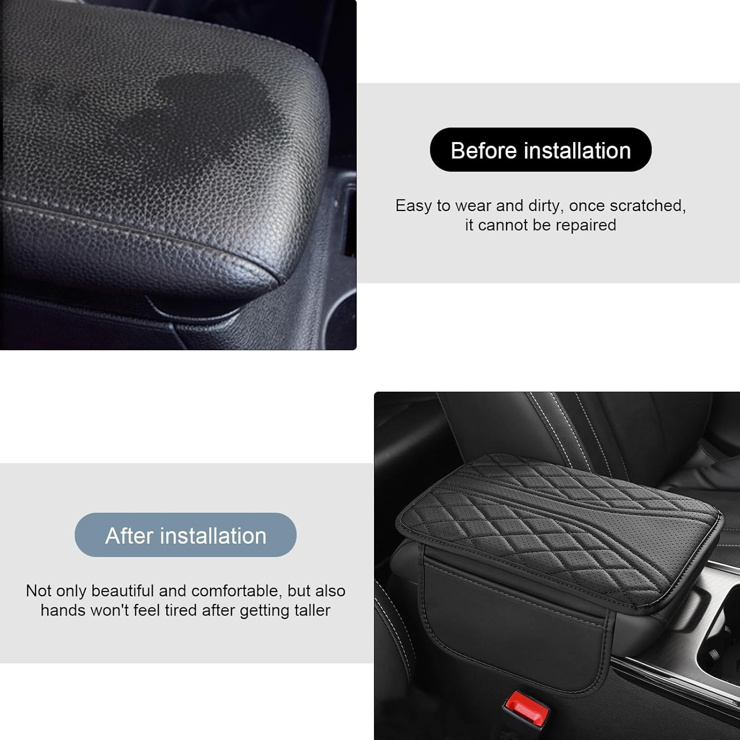 Strong Support and Protection: The car armrest cover is ergonomically designed to provide comfortable and reliable support for your arms and effectively relieve arm fatigue. At the same time, it also provides full protection for your center console against damage, wear and tear, pet claws, dirt and keeps it looking brand new for a long time.