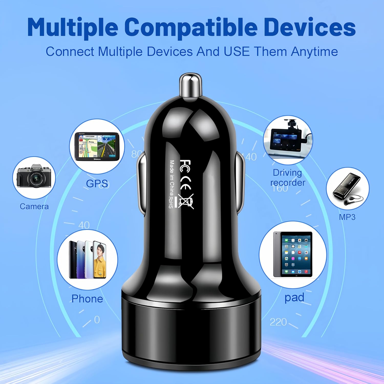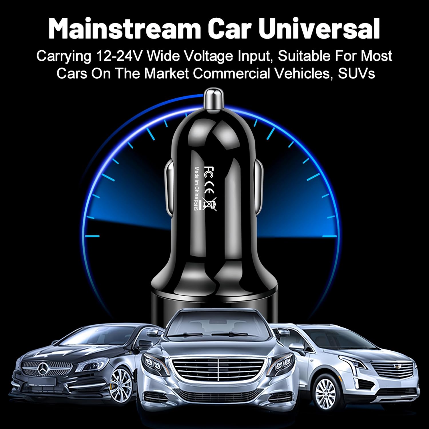 Universal Car USB Charger : Car lighter usb adapter widely used in vehicle models with 12-24V voltage input,compatible with family cars, business SUV, off-road vehicle, truck etc.