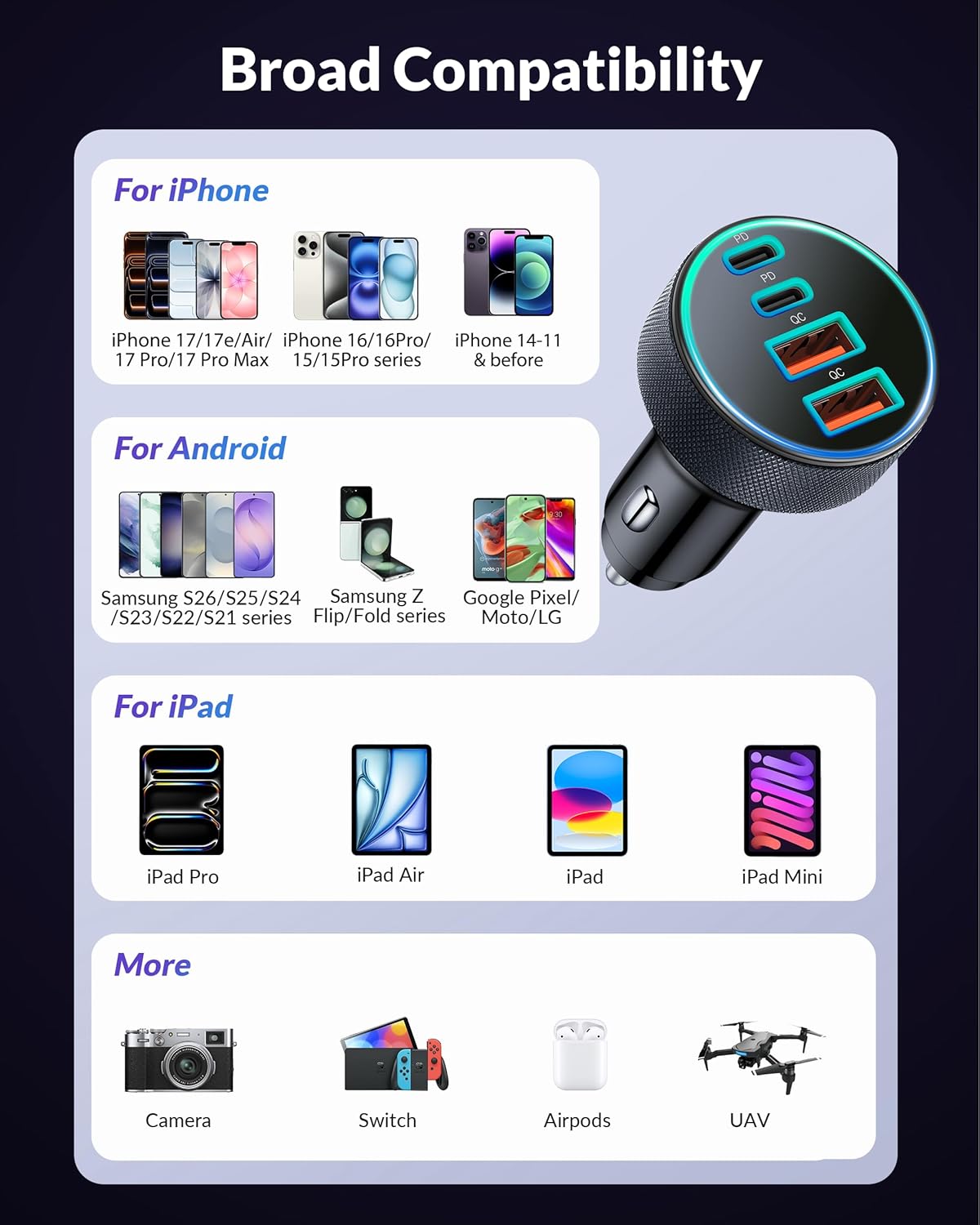 Widely Compatibility: [4 in 1] 90W Multiport Fast Car charger compatible with iPhone 17/17e/17 Pro/17 Pro Max/Air/16e/16/15 /14/13/12/Pro Max/11/XS/XR/X, iPad Pro/Air/Mini, Mac Book Pro/Air 2025/2024/2023/2022/2020/2018, AirPods Pro 3 2, AirPods 4/Max, Samsung Galaxy S26 Ultra/S26+/S26/S25/S24/S23/S22/S21/S20/Ultra, Note 20/10/9/8, Google Pixel 10/9/8/7/6/5/4/3 XL, LG, Moto, Tablet, Laptop, Android Phones, Driving Recorder and more