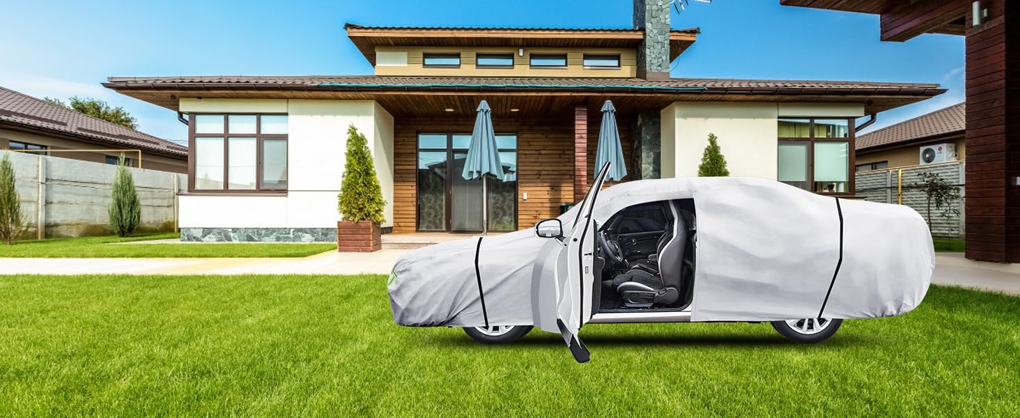 【Convenient and save time and space】: Our car cover easy to install and remove, making it convenient to use. and with a waterproof bag, making it easy to fold and carry in your trunk without taking up extra space;Accessible door zipper,easy entry into the vehicle.