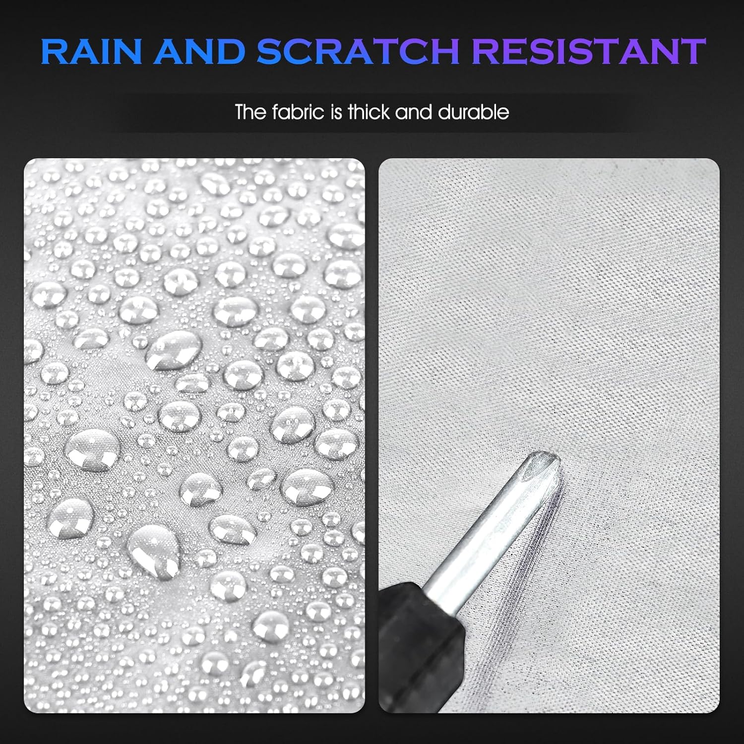 Snow Protection : Utillizing a multi-layer structural,design to effectively isolate snow and hailSun Protection : Effectively blocks 99% of UV ul-traviolet rays, aiding in the car’s anti-aging processWind Protection : Triple windproof cord fixation design, providing enhanced stablilty during windy conditionsScratch Protection : Soft cotton lining adds comfort, safeguarding car paint and effectively,preventing scratches and damage