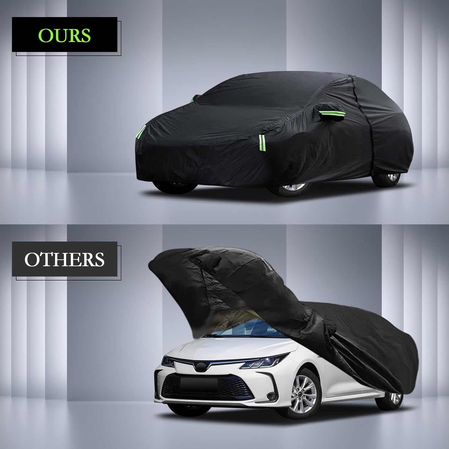 “This custom-fit car cover fits perfectly and provides excellent all-weather protection. The material feels durable and waterproof, keeping the car clean and dry in rain, dust, and sun. It’s easy to put on and take off, stays securely in place, and doesn’t flap around in the wind. A great option for protecting a Toyota Corolla