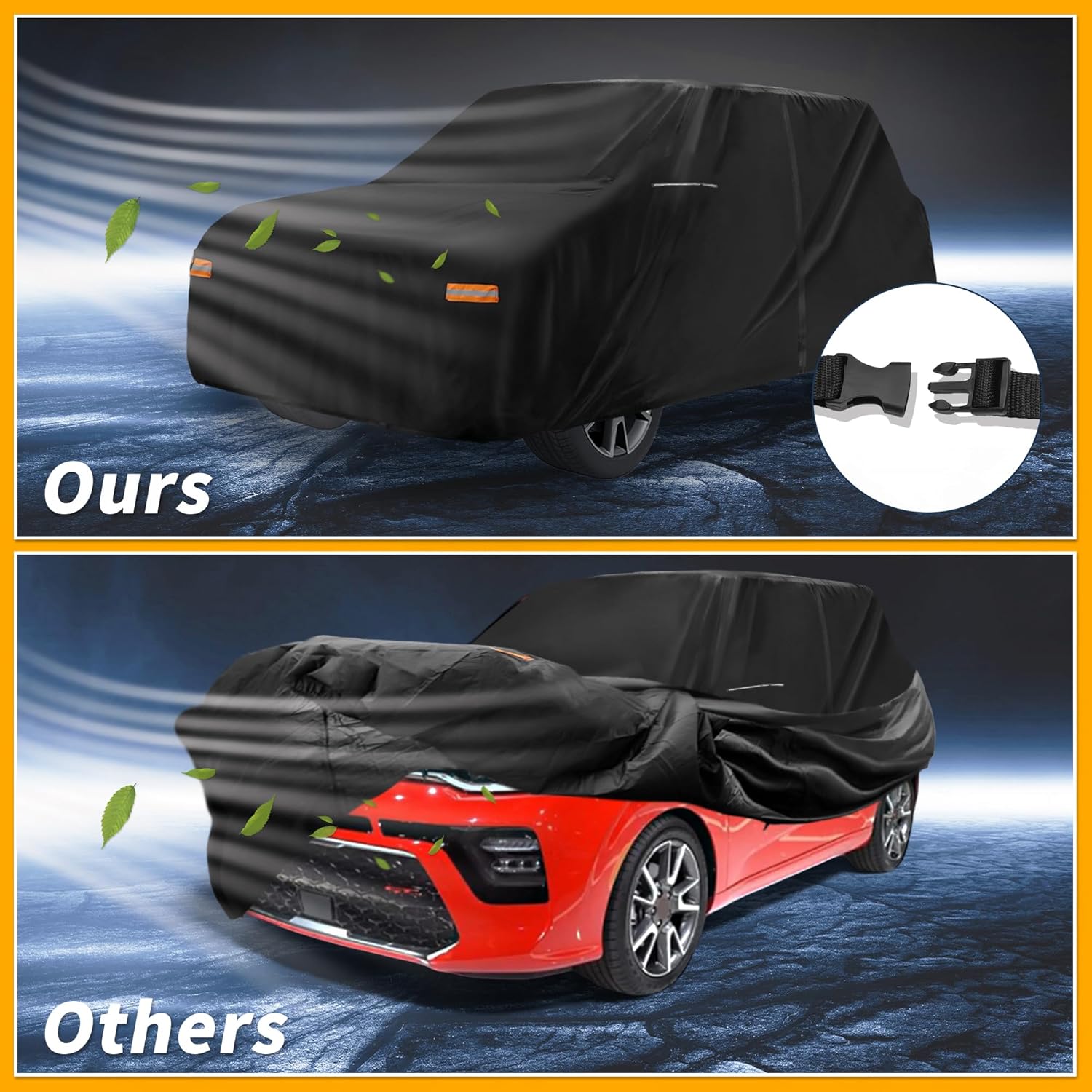 [SIMPLY TO USE]Full car coverings are meticulously crafted with elastic cords and windproof buckles. This design enables even those who are using a car covering for the first time to install it in less than a minute with ease. The car-covering is equipped with a convenient zipper. This zipper allows you to access and return to the car without the need to reopen the entire car cover