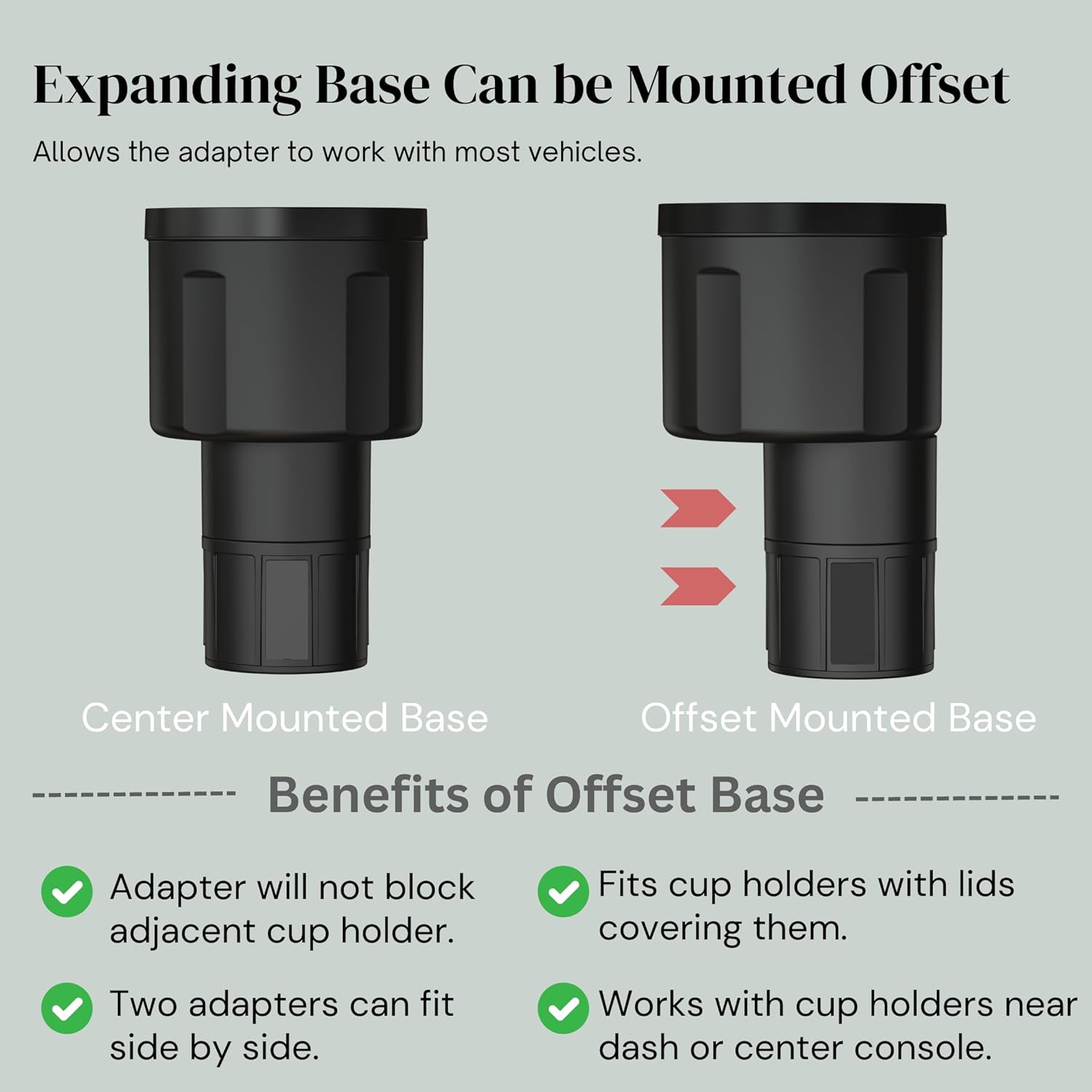 Increased Functionality: Offsetting base adapts to most vehicle cup holder configurations. Prevents blocking the adjacent cup holder and allows two adapters to be used side by side.