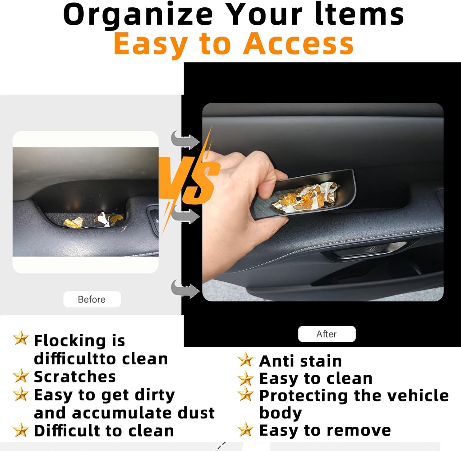 Easy to install and remove: It takes only a few seconds to insert or remove. Simply insert the car storage box into the corresponding door handle groove to use. It is customized 1:1 for the original car, just like an OEM part. The door handle of this car used to look monotonous and difficult to clean. After installing this product, it changes the ordinary interior, making it easier for you to clean the door slot, making it appear high-end and unique. This is your must-have accessory!