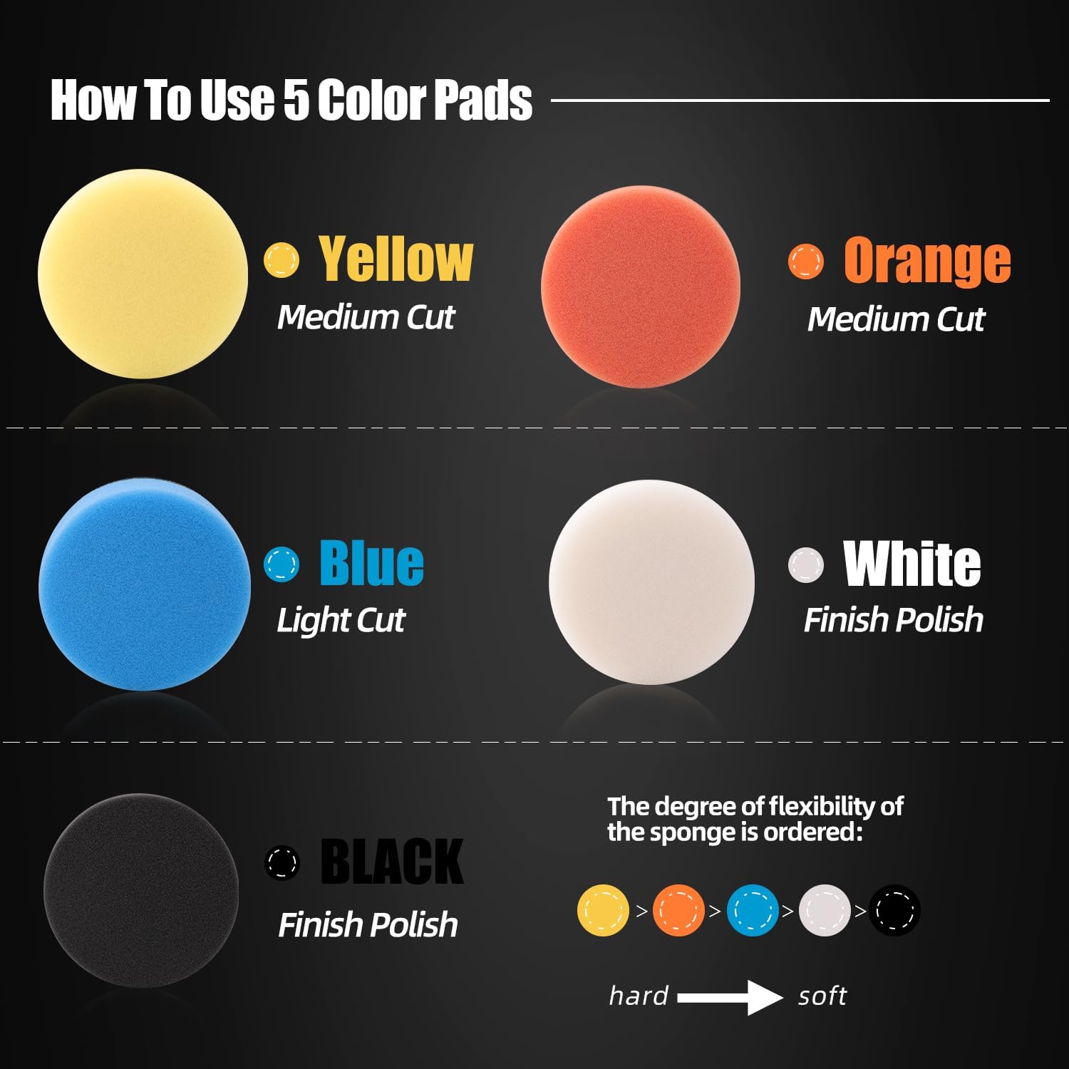 ◆Specifics◆ Prime quality wool pad, sponge pad, bendable, washable and reusable. Different colored sponges have different softness,suitable for polishing rough and small areas. With Adhesive backing, you can change pads just in seconds.