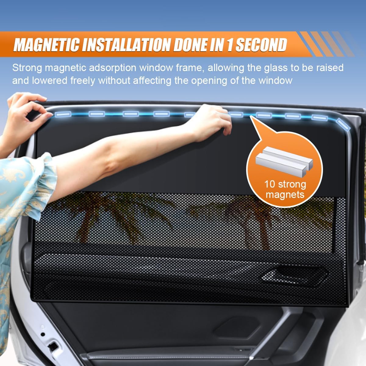 【Magnetic Attachment】:This car window curtain is equipped with multiple strong magnets that securely attach to the metal window frame. Installation and removal are quick and convenient, allowing you to adjust the position as needed without affecting the normal operation of the window. Note: This sunshade is not suitable for plastic or rubber frames, or frameless windows.