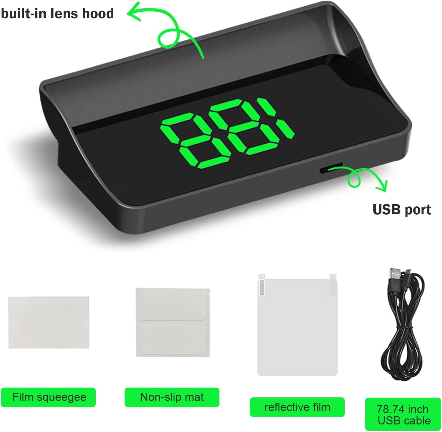 Package: You will get 1 x car heads-up display with green projection, 1 x 6.56 Ft cable, 1 x anti-slip mat, 1 x squeegee, and 1 x reflective film. It automatically powers on when the vehicle is started and automatically powers off when the vehicle is turned off.