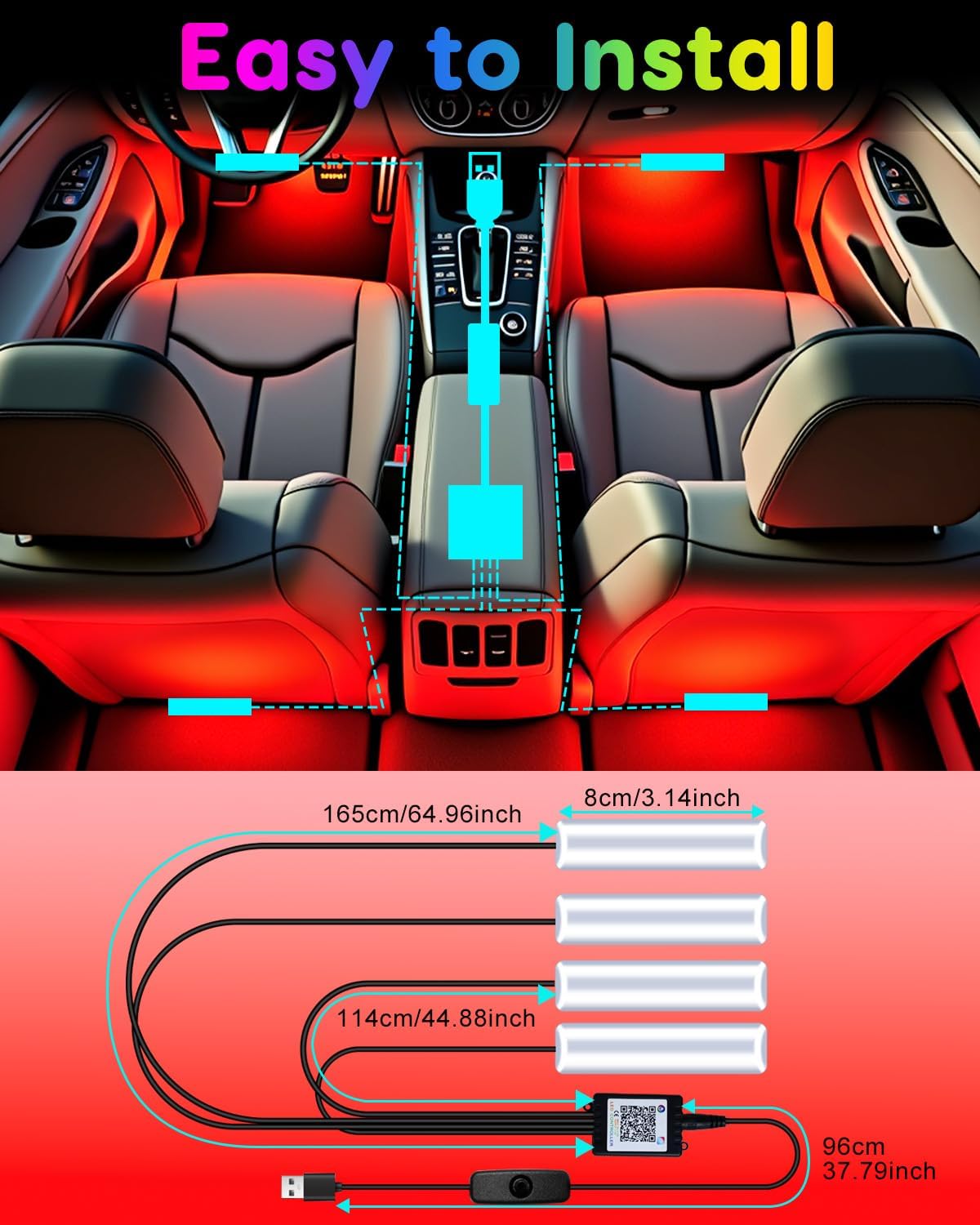 【Easy to Install and Hide】The car interior light is designed with strong double-sided tape and extra long cable (the long cable is 165cm, the short cable is 114cm), you can easily hide the cable in the crevice of the car’s foot mats, no need to worry about the exposed cable or messy appearance.