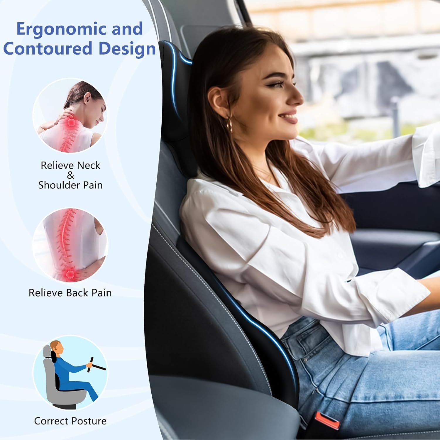 COMFORTABLE CAR SEAT CUSHION: Our scientifically designed ergonomic memory foam car seat cushion can provide you with ultimate driving comfort and support. The cushion set fills the gap between the seat and your body and is expertly designed to relieve back, sciatica and tailbone pain, making it ideal for improving your driving posture on long drives, daily commutes and short drives.