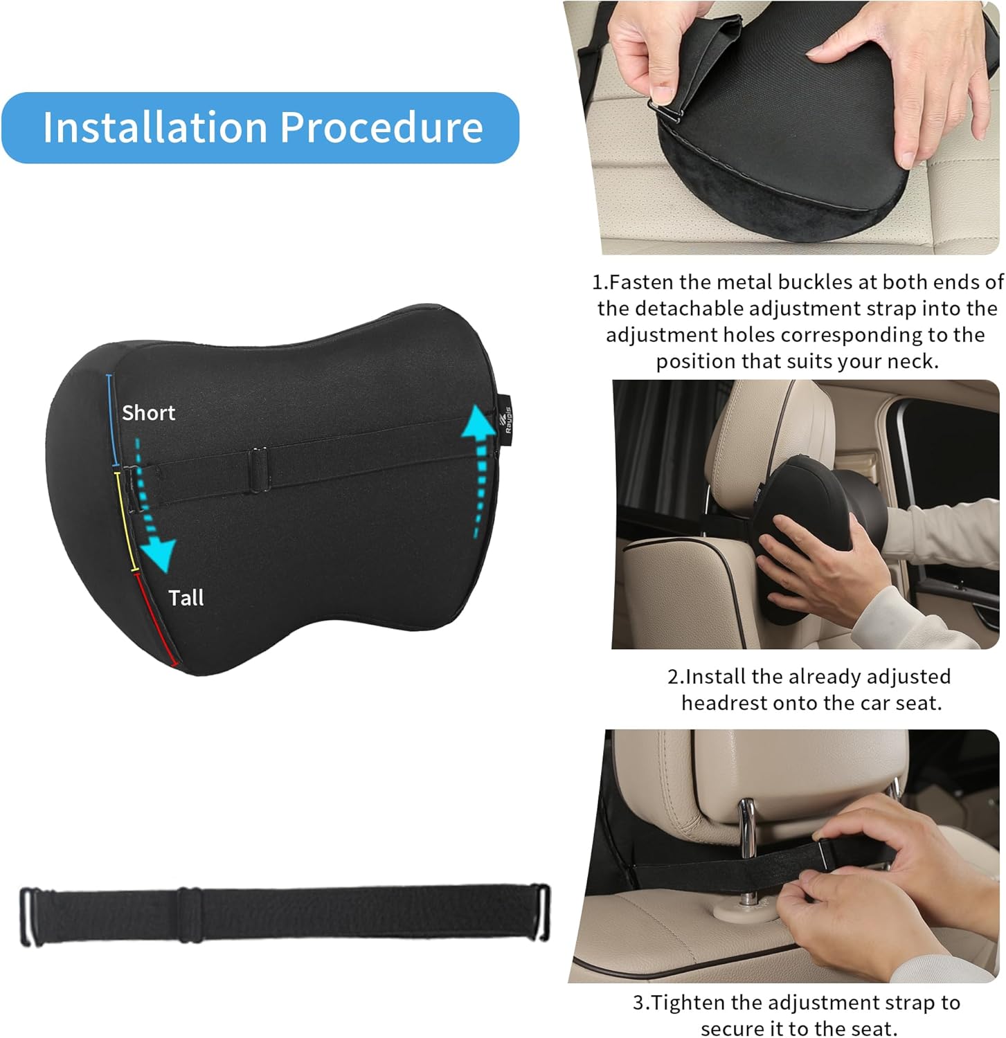 【Installation method & packaging instructions】Easy installation in 30 seconds:1.Choose your preferred height and then lock the detachable adjustable strap into the perforated adjustable strap.2.Install the already adjusted headrest onto the car seat.3.Tighten the adjustment strap to secure it to the seat.It’s especially suitable for short people.Our headrests are vacuum-packed. After opening, they need to be left undisturbed for 24 hours to recover. There may be slight creases on the headrest fabric, but this does not affect its use. The creases will disappear after a period of use.