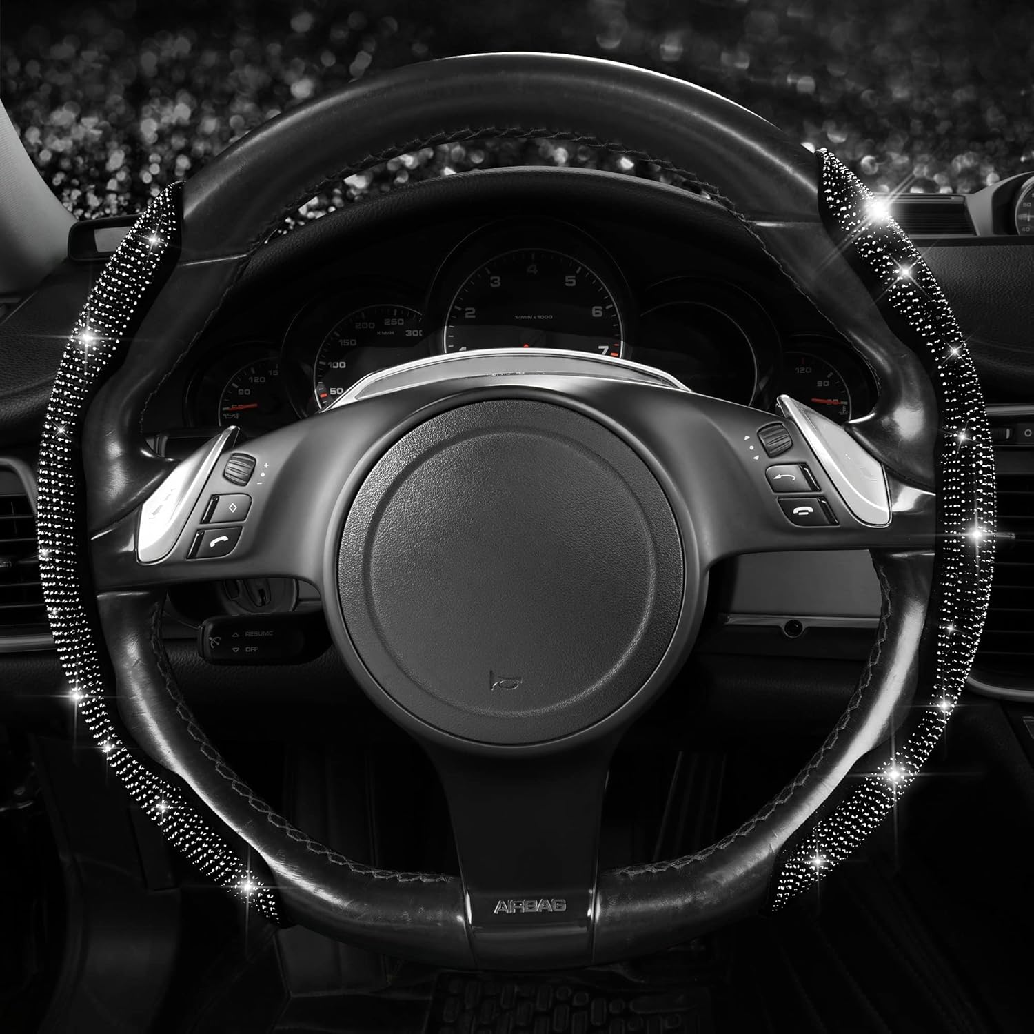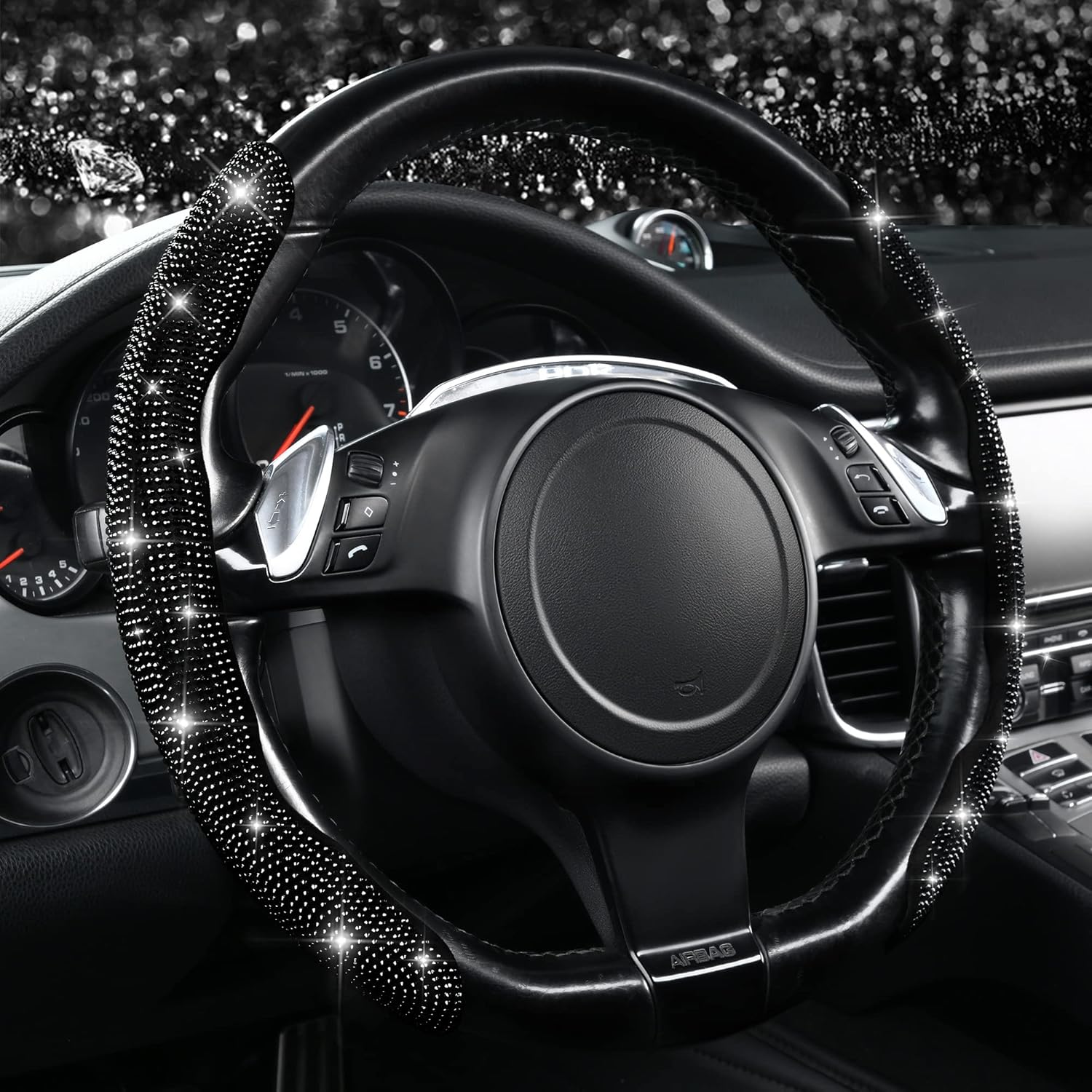 PREMIUM MATERIAL: Made of premium ABS materials and top Rhinestones craftsmanship. Sparkle rhinestone massage your palm, relieve driving fatigue, make your hand feel comfortable. Breathable, no smell and anti-slip. The bling diamond detail make you feel great to touch. When the sun hits it, the sparkle your car