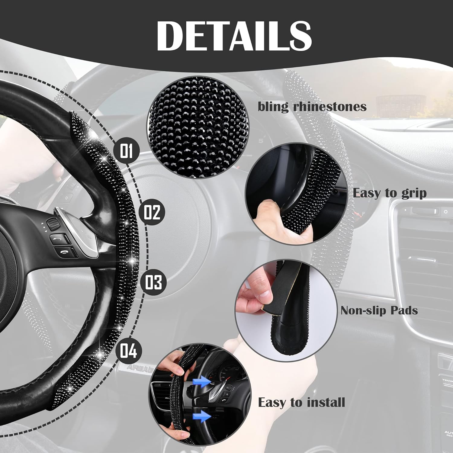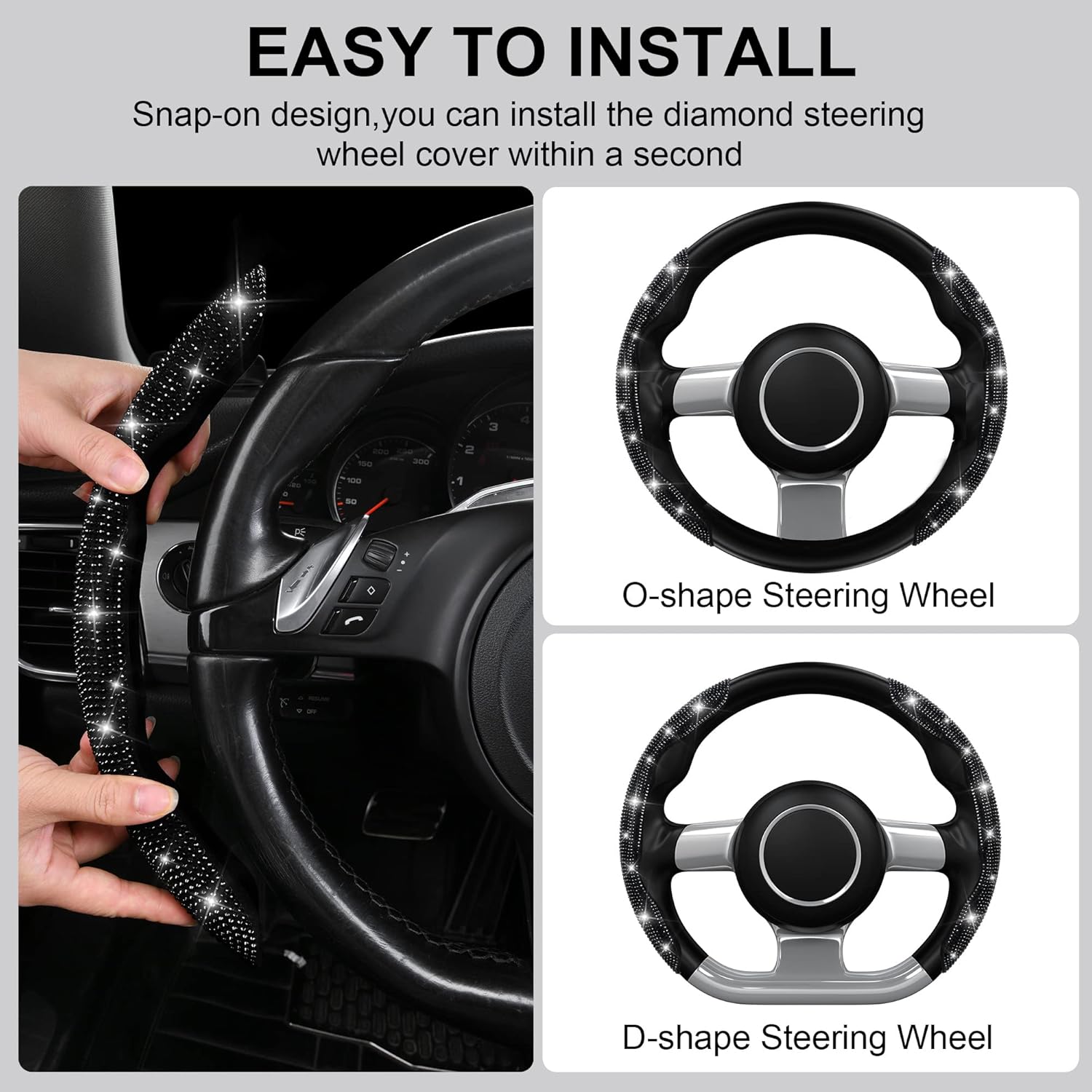 HOW TO INSTALL AND REMOVE: Bling diamond Steering wheel cover is very slip resistant. Includes lined pads to protect your steering wheel. After installing the pads. Place the car steering wheel cover on the steering wheel, they fit perfectly and do not slip. It is a good helper to protect your steering wheel from sunburn and scratches. Lighter and thinner than most similar products.