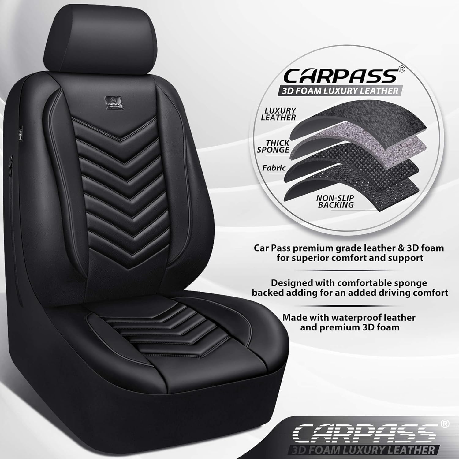 CAR PASS 3D Foam Faux Leather Car Seat Covers Full Set,Waterproof Leather Seat Cover for Cars,Luxury Universal Fit for SUV Truck Sedan Automotive, Armrest Airbag Compatible Anti-Slip, All Black
