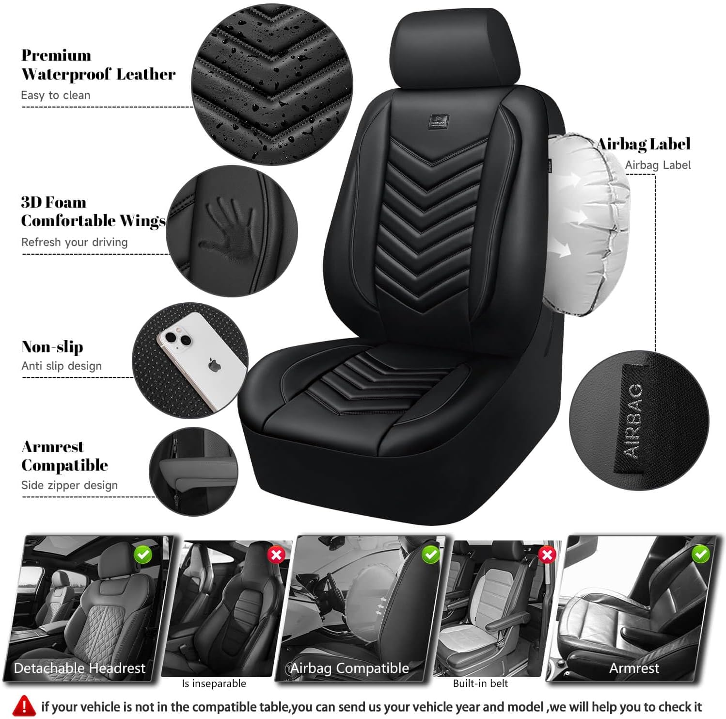 1 Premium Material 2 Comfortable Wings 3 Armrest Compatible 4 Airbag Compatible 5 Anti-Slip Design