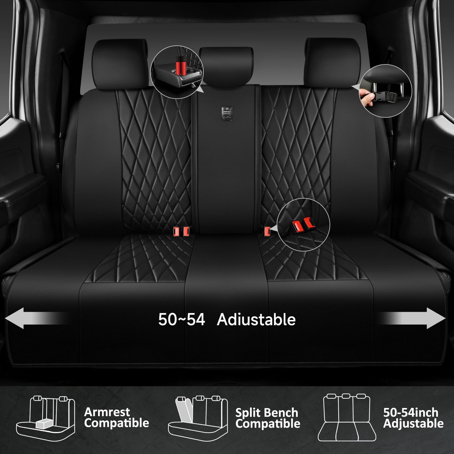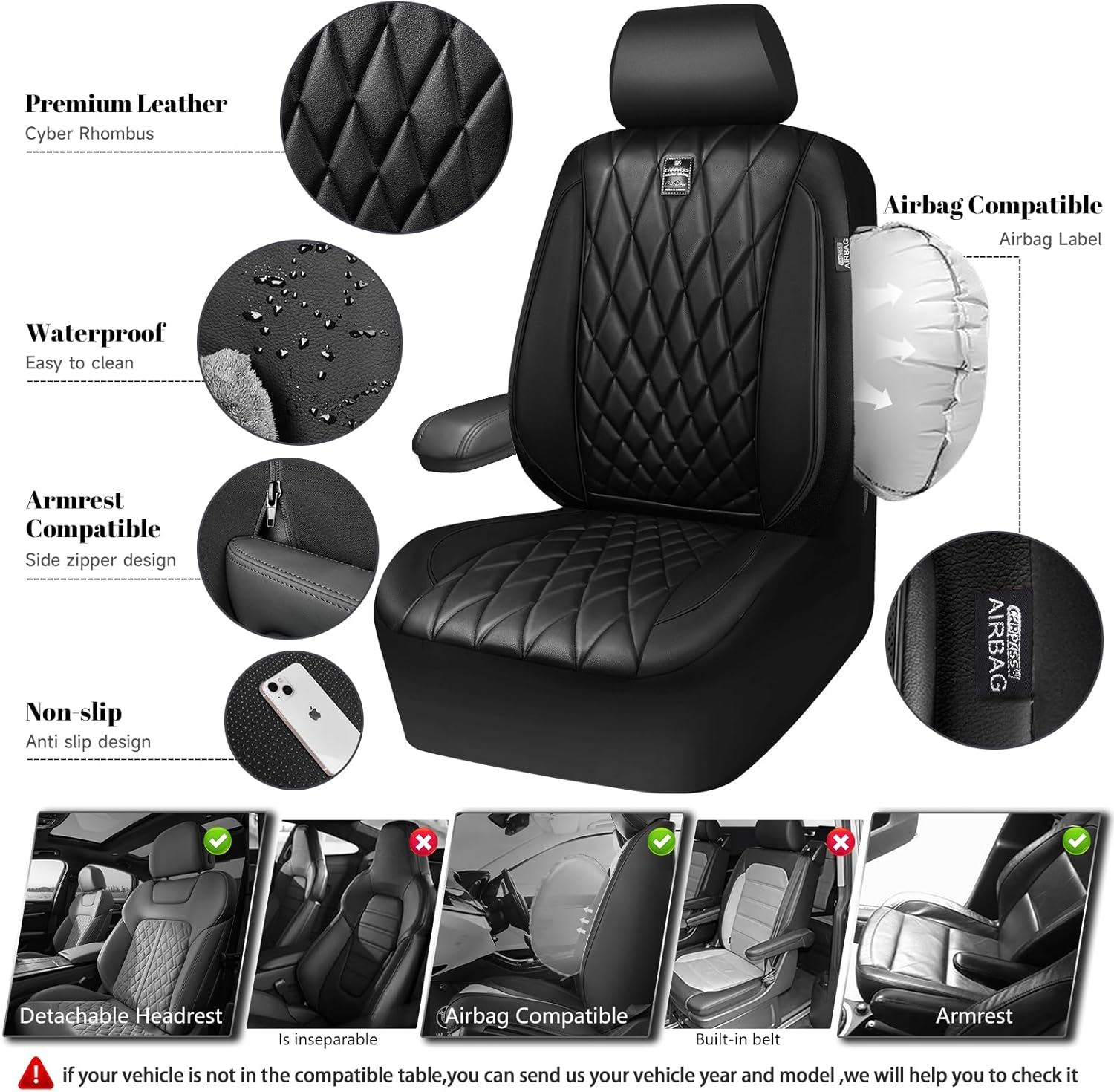 【PREMIUM LEATHER SEAT COVERS】Black seat covers full set are made of premium leatherette leather & a stylish diamond-shaped design, adding a touch of fashion and luxury to your car’s interior. At the same time, protect your seat from spills, stains, pet hair. They are scratch restant, waterproof, durable.