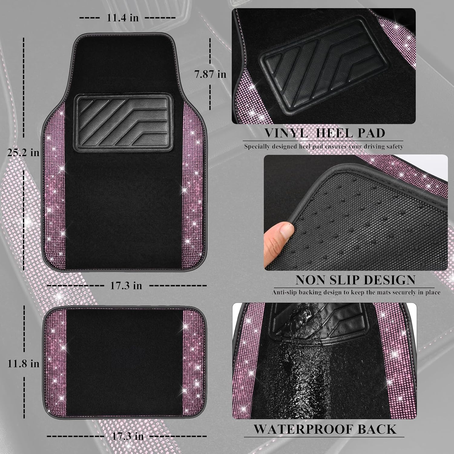 SIZE AND COLOR – Universal size fits most vehicles: car, sedan, SUVs, truck, vans. Front Mat: 17.3″ W x 25.2″ L, Rear Mat 11.8″ W x 17.3″ L. Package Includes (4pcs) : Front Mat*2, Rear Side Mat*2. There are sparkling diamonds in different colors on the side of the mat, those diamonds make your car beautiful and shiny. Perfect cute gift for women and girls.