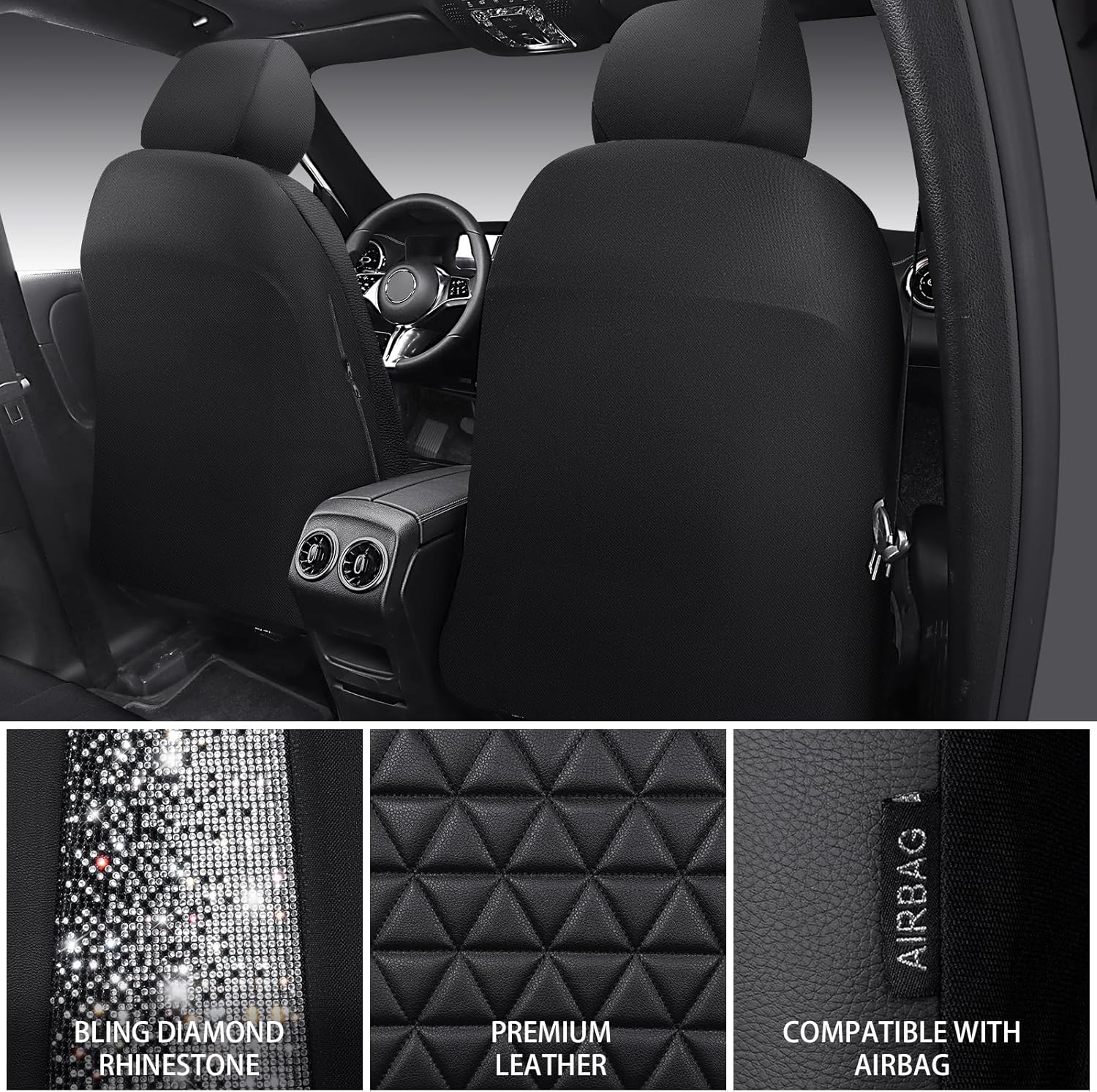 BLING LEATHER SEAT COVER – Premium rhombus leather design lined sponge with pretty rhinestones. Luxury black pu leather with shiny rhinestones perfect for women, girls. Perfectly match your car’s interior look. Ensure your seats of your vehicle will last for many years to come. Refresh your interior look. Beautiful design with good quality. Top grade diamond craftsmanship, firm and not falling off