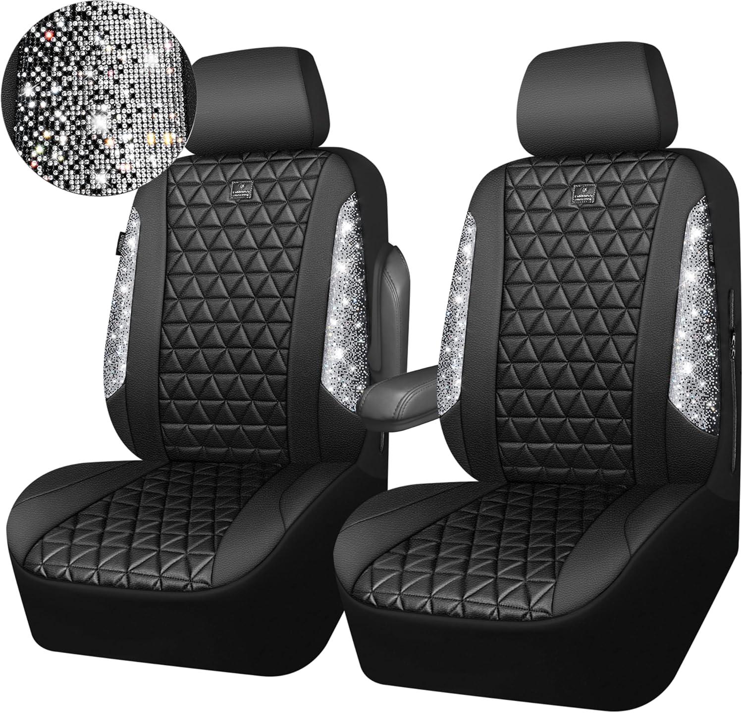 CAR PASS Bling Diamond Leather Car Seat Covers for 2 Front Interior Sets, Waterproof Shining Glitter Sparkly Crystal Universal Armrest Fit Automotive Truck SUV Cute Women Girl, Black Silver Rhinestone