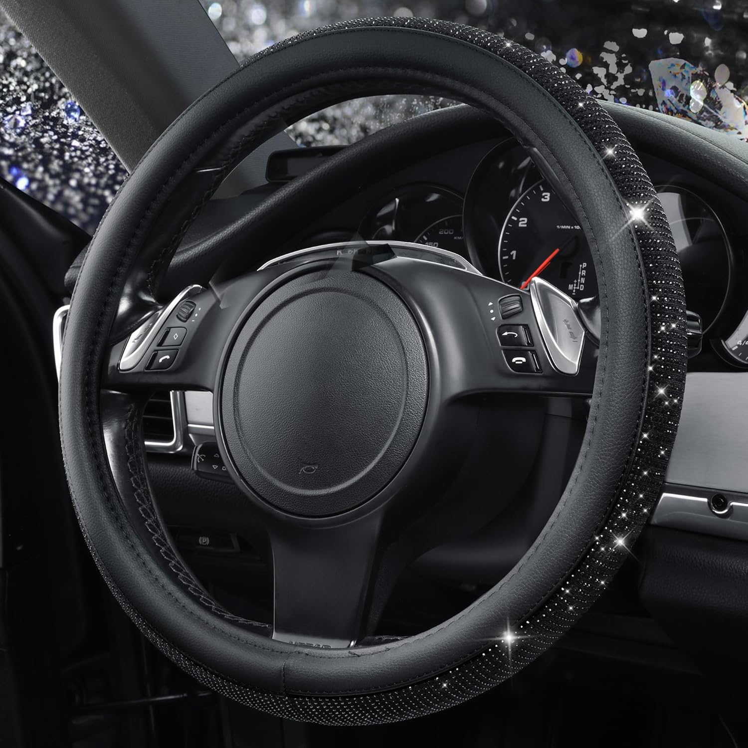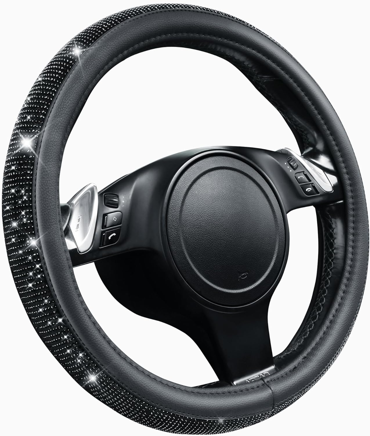 CAR PASS Bling Diamond Leather Steering Wheel Cover, With Sparkly Crystal Glitter Rhinestones Universal Fit 14″1/2-15″ Car Wheel Protector for Women Girl Fit Suvs,Vans,Sedans,Car,Trucks, Black Diamond