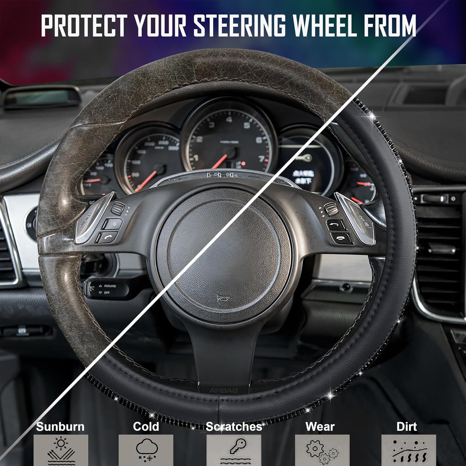 DIAMOND & LEATHER: Premium Quality Material: PU Leather and Top diamond craft work.The black diamonds on the velvet. The Bling Crystal Steering Wheel Cover made of durable microfiber leather and diamond, consisted hundreds of shiny rhinestones. Super Sparkly, Better Spotlight, Non-Dropping Diamond, Comfortable Feelings, does not scratch hands, and has good anti-slip effect.
