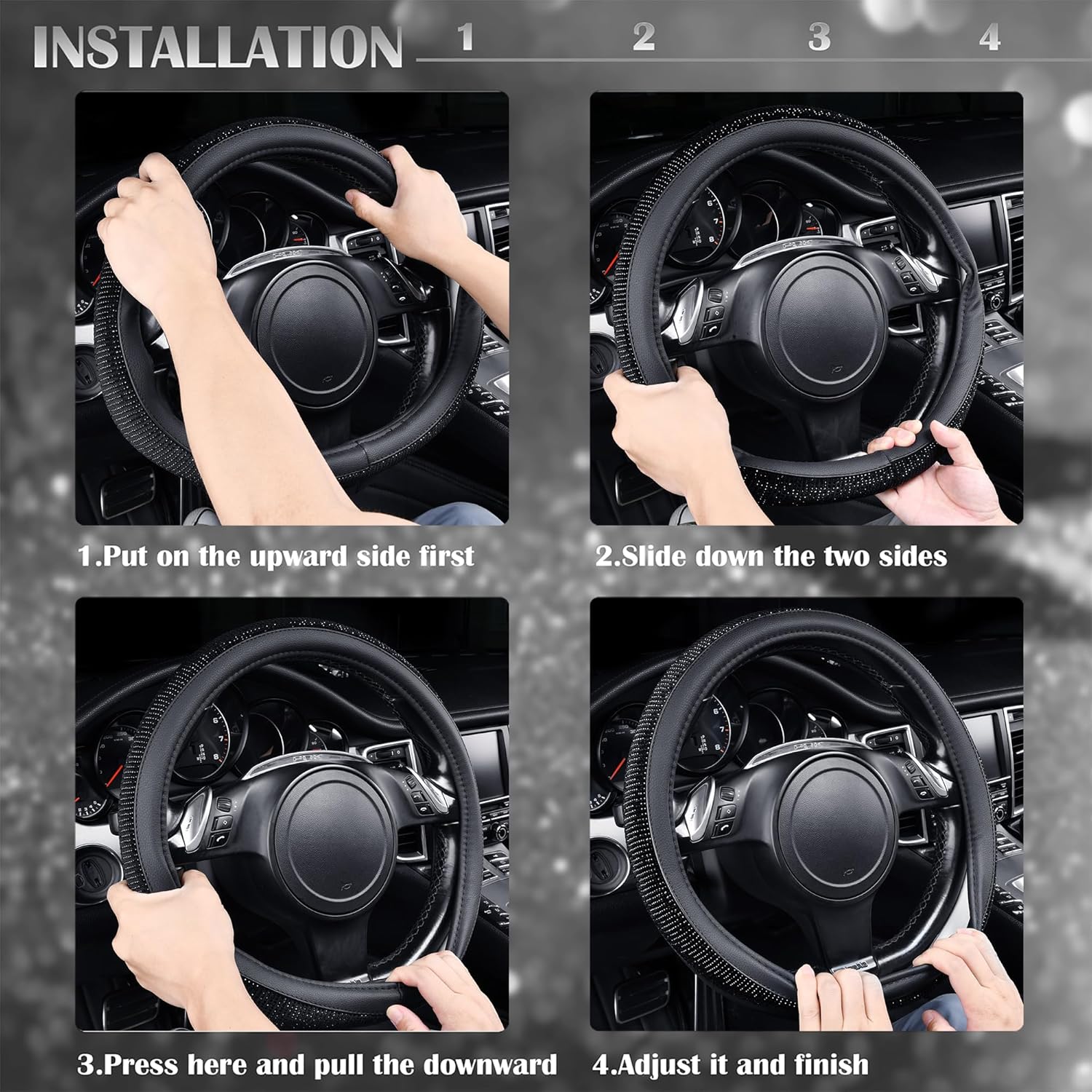 EASY INSTALLATION: This PU leather with Diamond steering wheel cover requires hassle-free installation (You can refer to the installation instructions on our product page). Simply slip it right on to your steering wheel and your good to go. Just place the cover on top of the steering wheel. Press and hold the upper part of the cover and gradually lower it with both hands on either side to tighten.