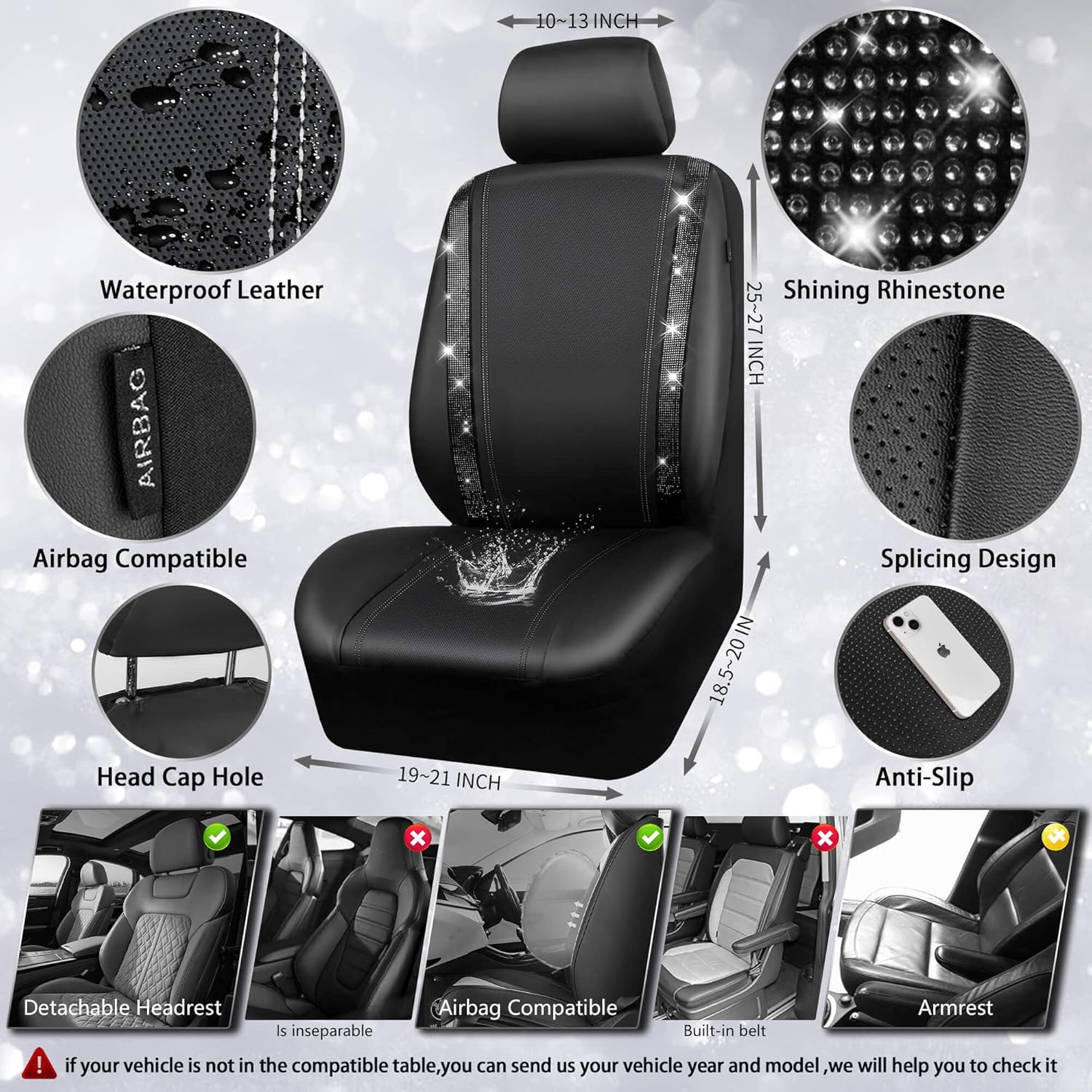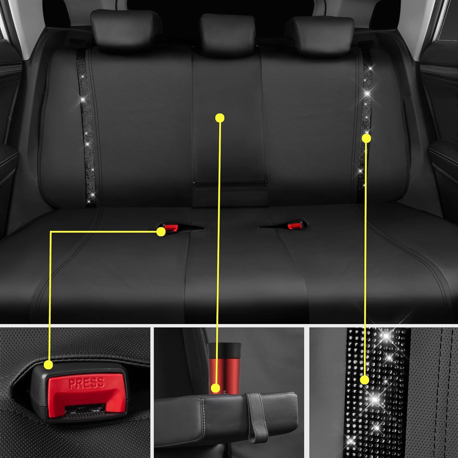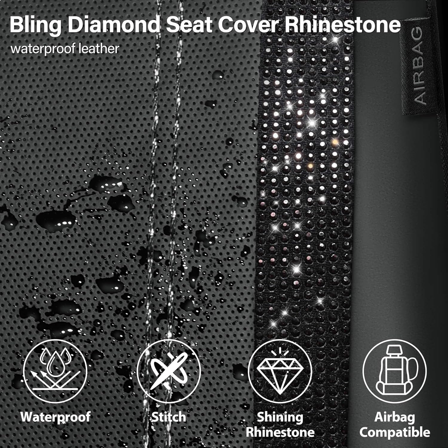BLING DIAMOND CAR SEAT COVERS: Premium PU Leather Durable Water resistant with pretty Bling bling rhinestones Made. Black leather with shiny rhinestones, sparkly bling diamond design perfect for women, girls. Perfectly match your interior look. Ensure your seat covers will last for many years to come. Refresh your interior look. Beautiful design with good quality.