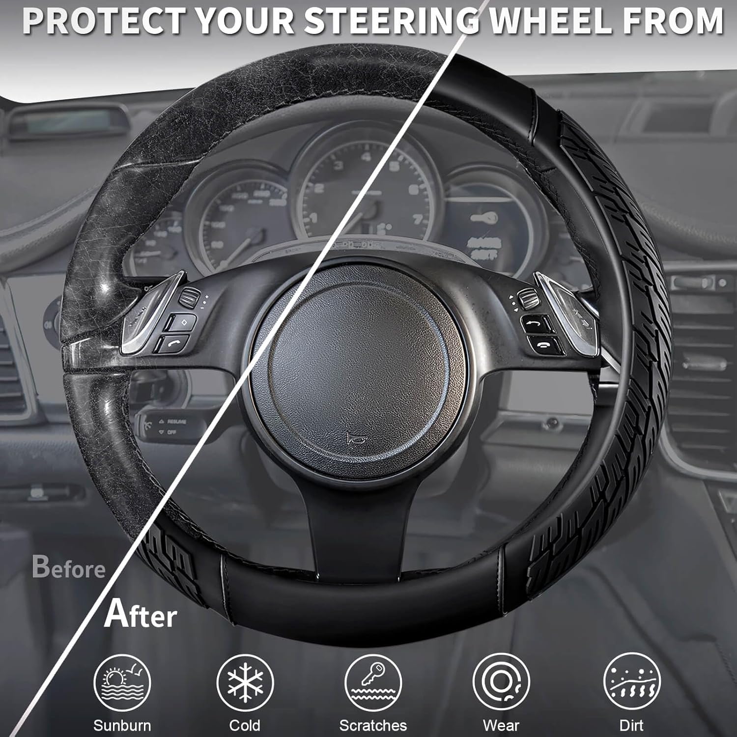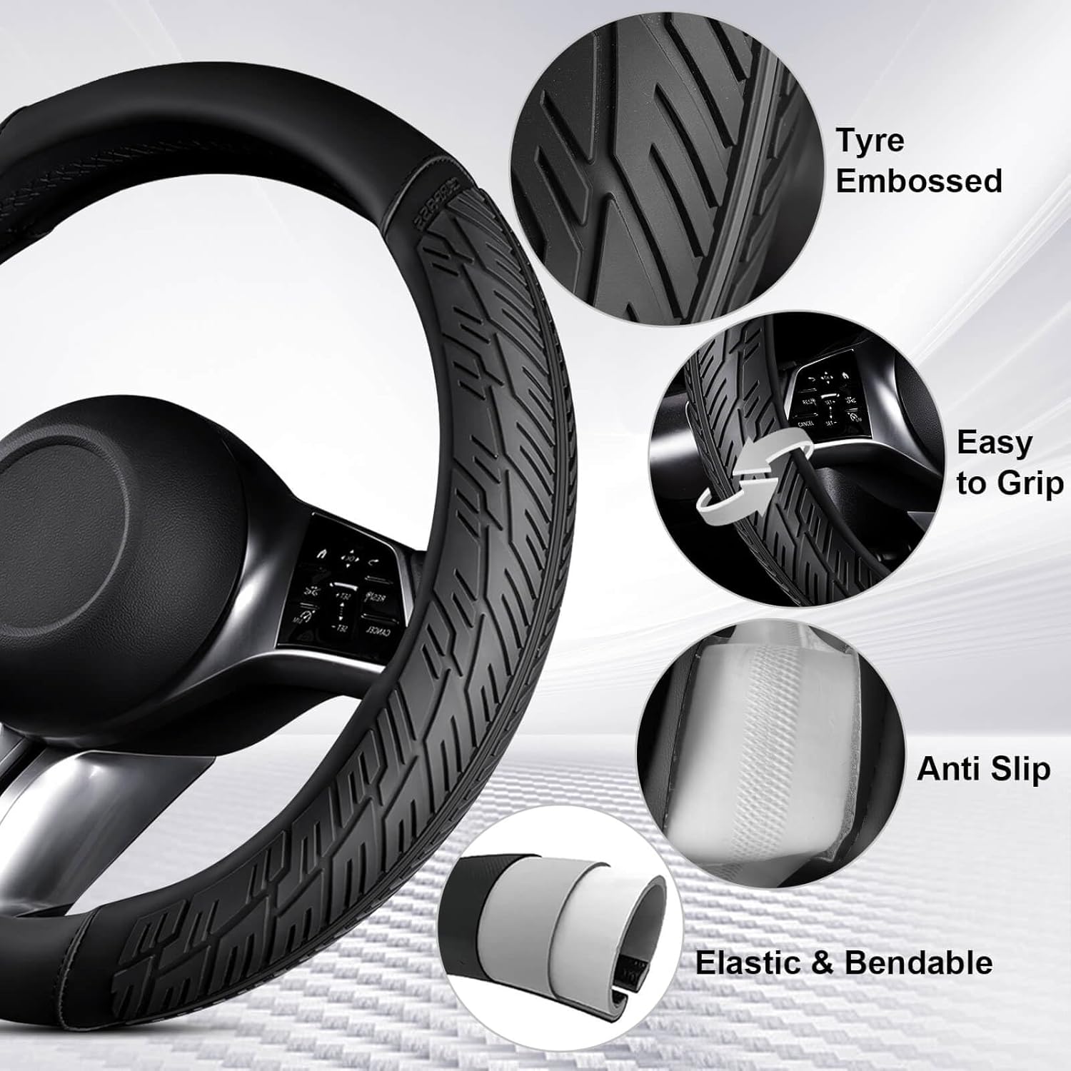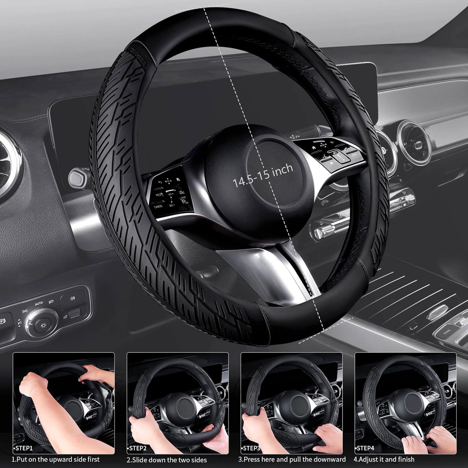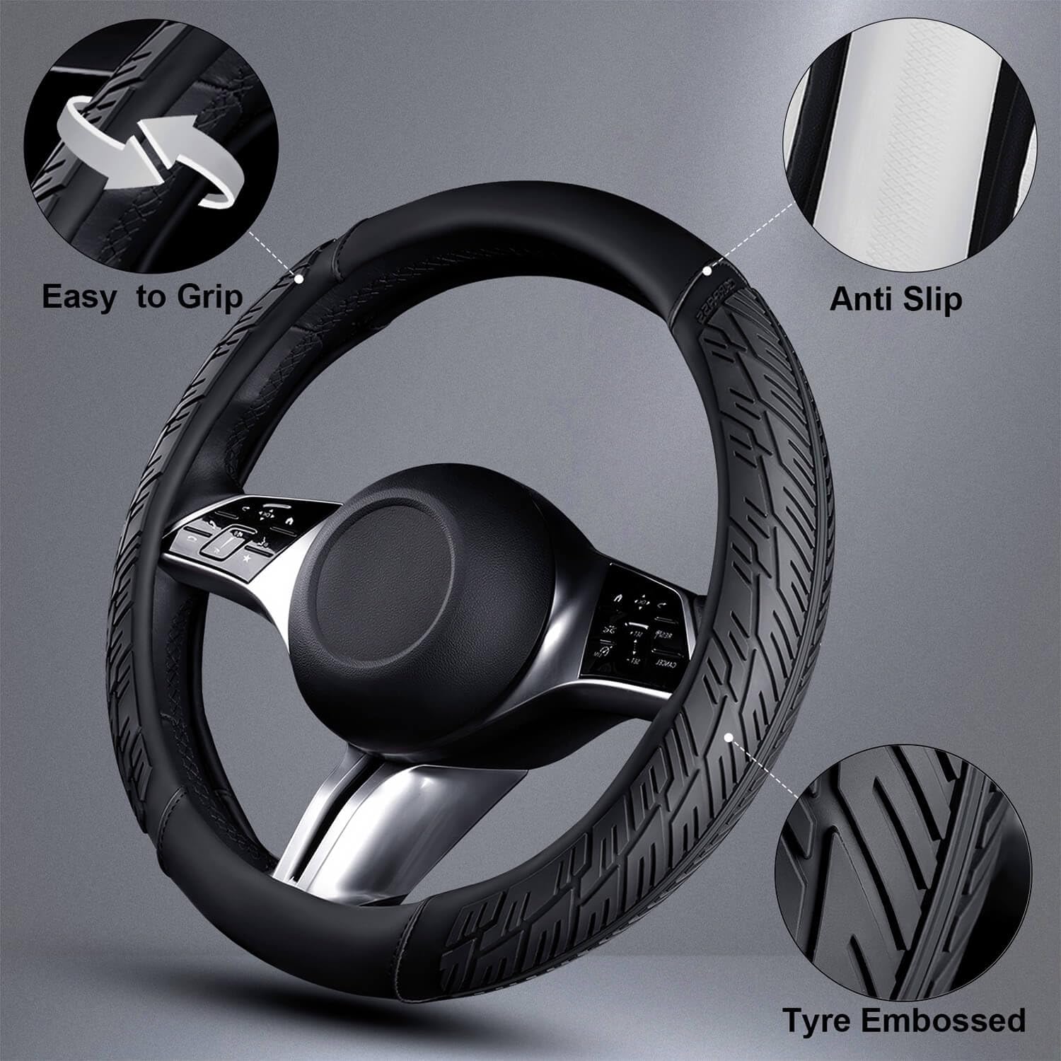 FASHION TREND:The car steering wheel cover adopts a fashionable tire tread pattern design. It not only has a powerful anti-slip effect but also makes your car look particularly unique and beautiful