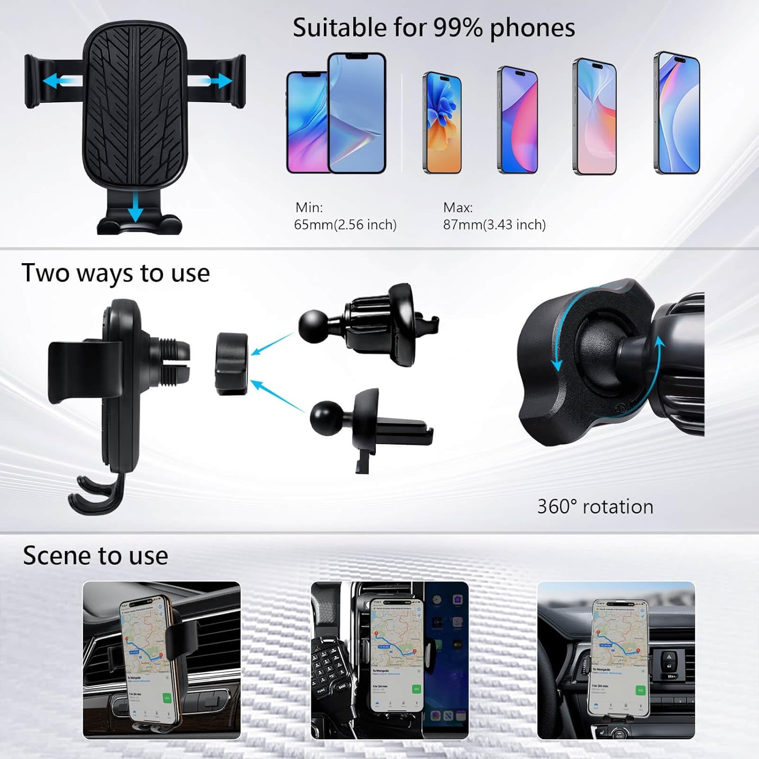 Fix your mobile phone while driving for easy map viewing.can rotate 360 degrees. It is suitable for 99% of car air outlets