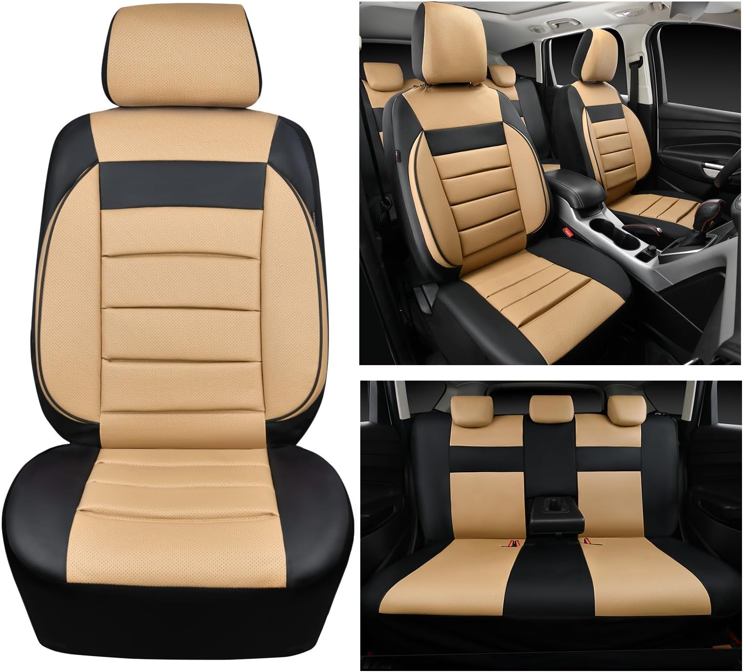 CAR PASS Leather Seat Covers Full Set Universal Water Resistant 3D Foam Back Support, Luxury Comfort Automotive 5 Seat Covers All Season Fit for SUV,Sedan,Van, Airbag Compatible Elegance(Beige Black)