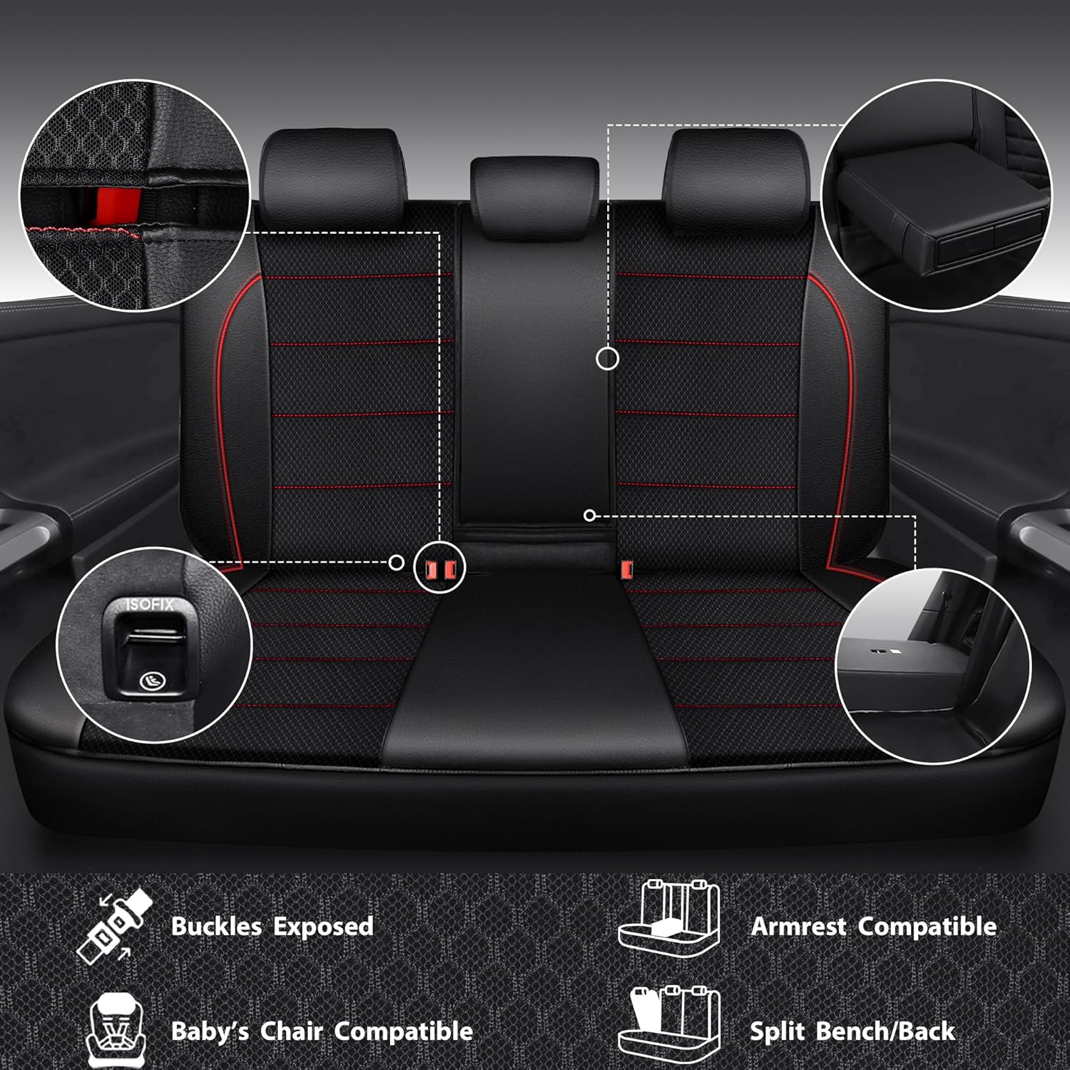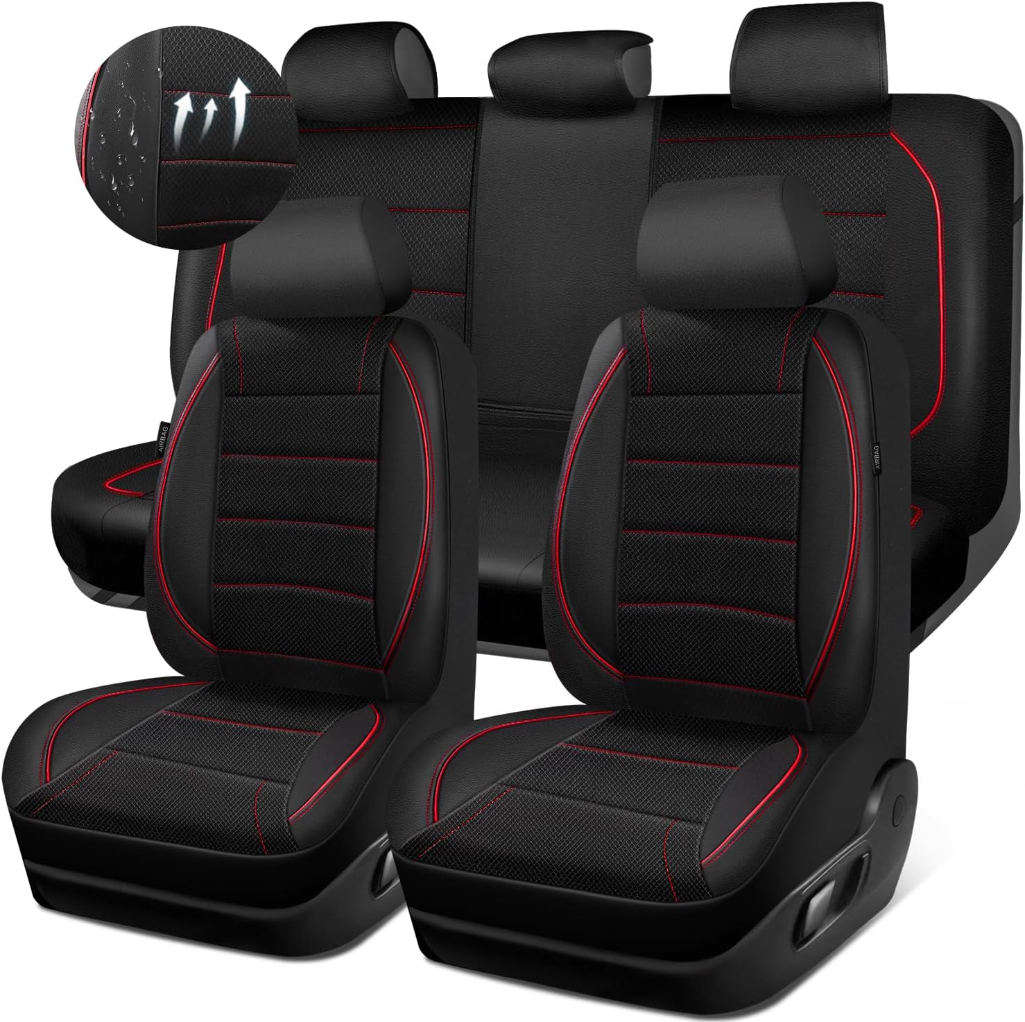 CAR PASS Mesh Leather Car Seat Covers Full Set,Breathable Mesh Faux Leather Seat Covers for Car, Universal Fit for SUV Truck Sedan Automotive, Airbag Compatible, Black and Red