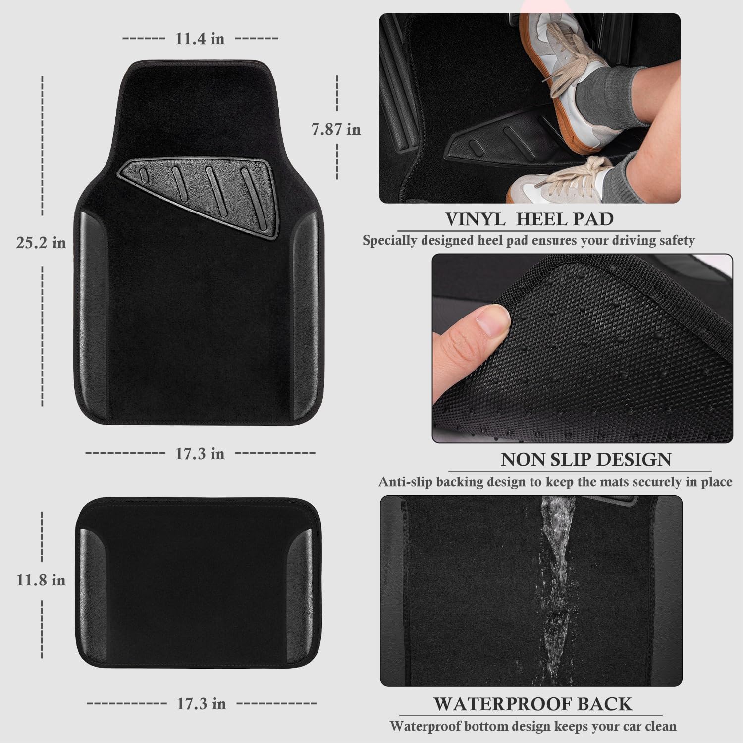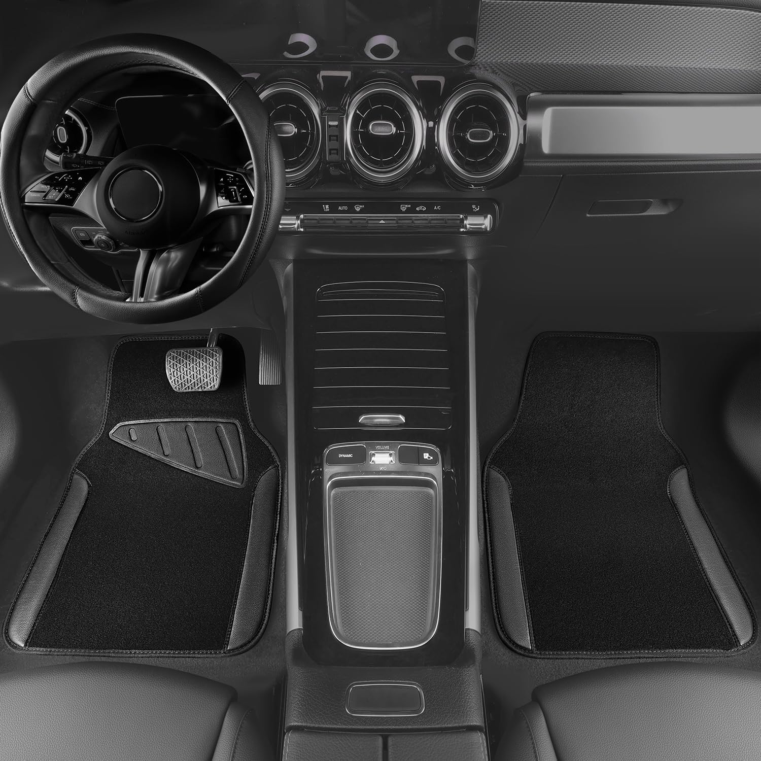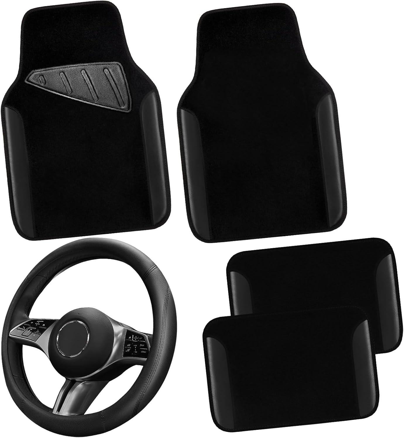 CAR PASS Microfiber Leather Steering Wheel Cover and Waterproof Car Floor Mats,Universal Car Combo Fit for 95% Sedan,SUV,Cars,14.5-15inch Anti-Slip Safety Comfortable Faux Leather Design(Solid Black)