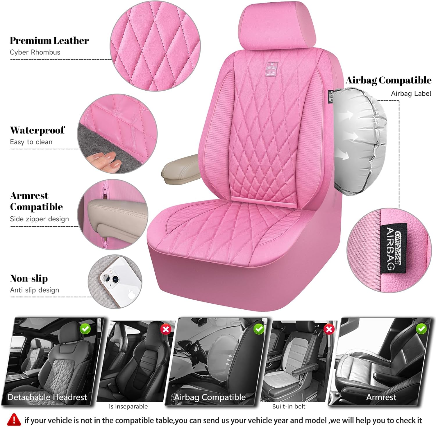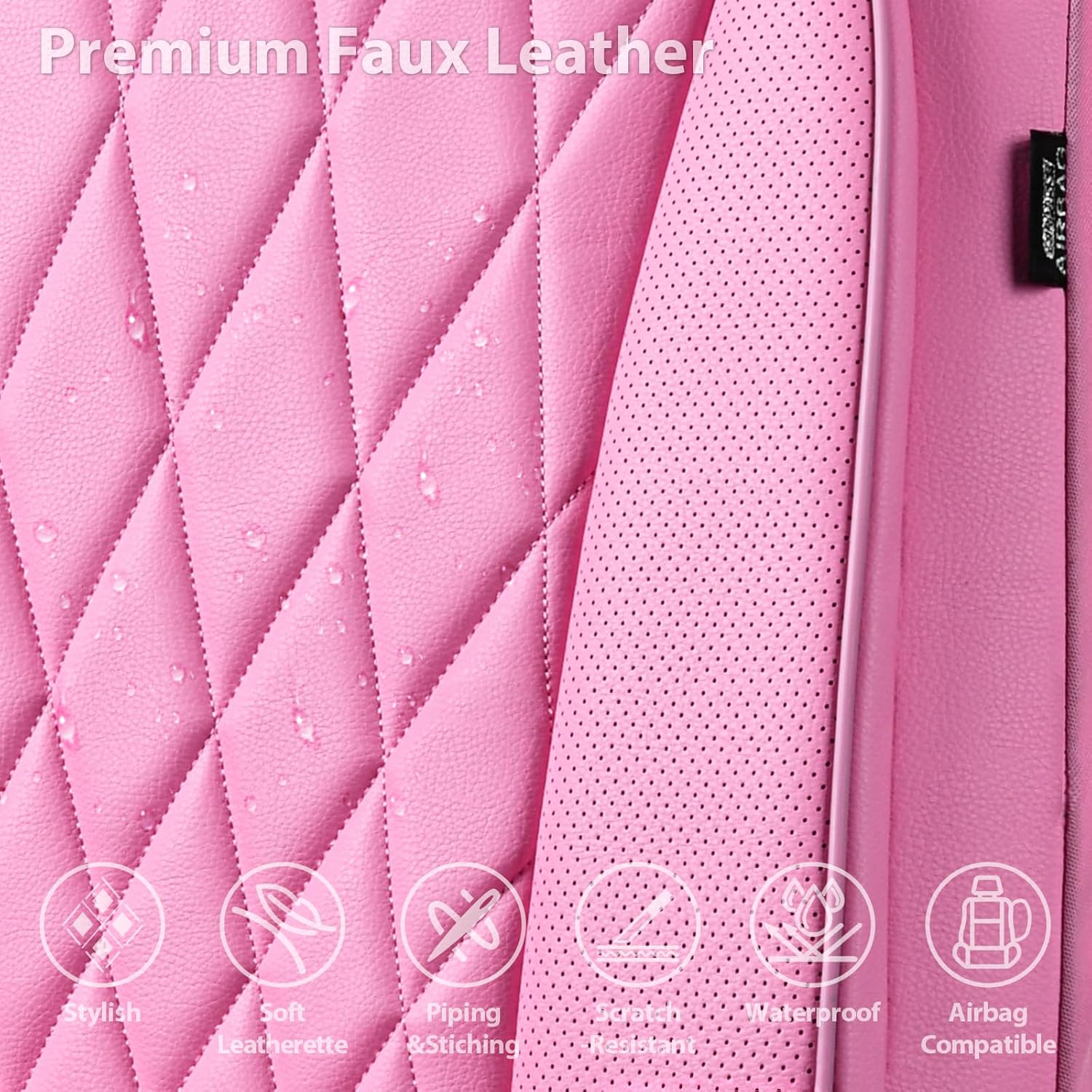 【PREMIUM LEATHER SEAT COVERS】Pink front seat covers are made of premium leatherette leather & a stylish diamond-shaped design, adding a touch of fashion and luxury to your car’s interior. At the same time, protect your seat from spills, stains, pet hair. They are scratch restant, waterproof, durable.