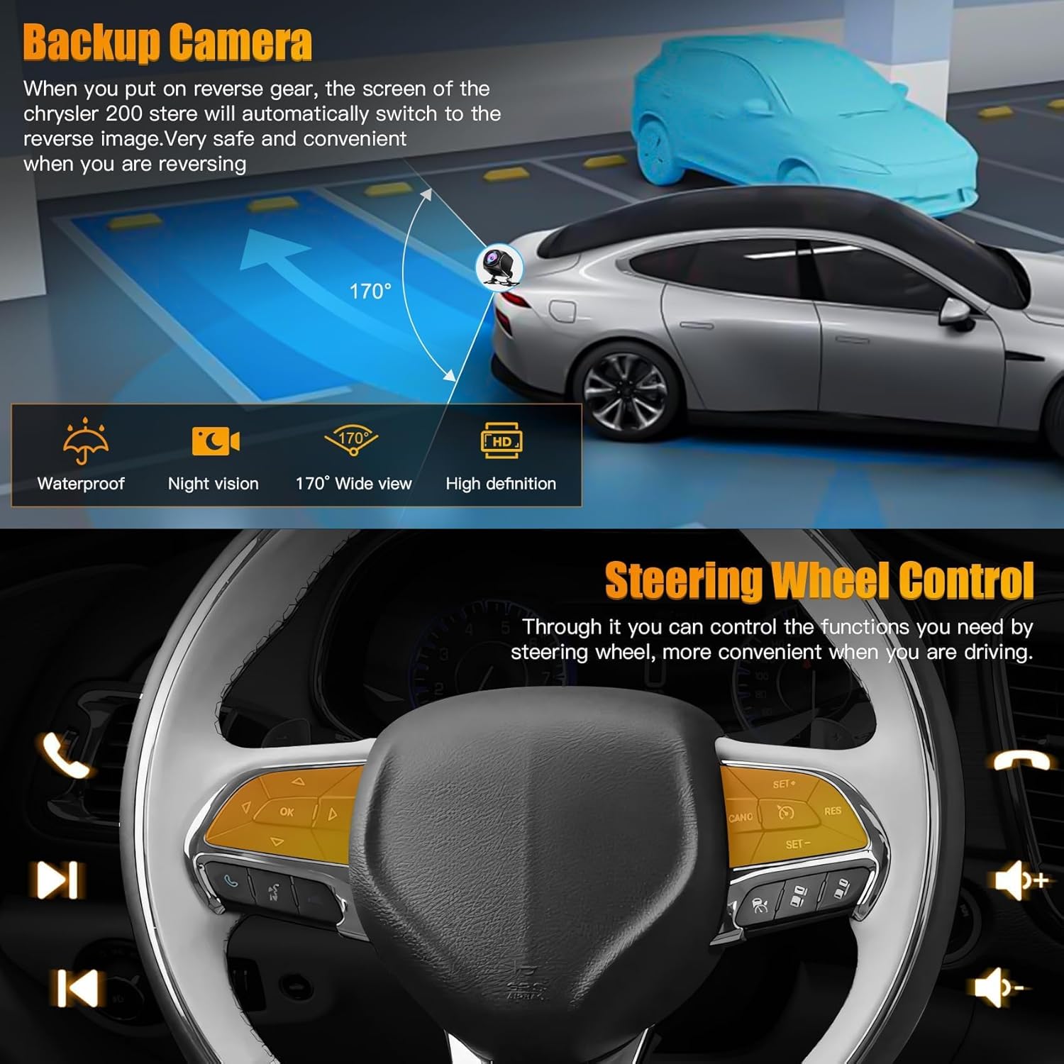 This head unit car stereo come with an HD waterproof night vision rear-view camera with 170° ultra-wide viewing angle. support front & rear view camera with an automatic display image when in reverse. (Front camera not included)
