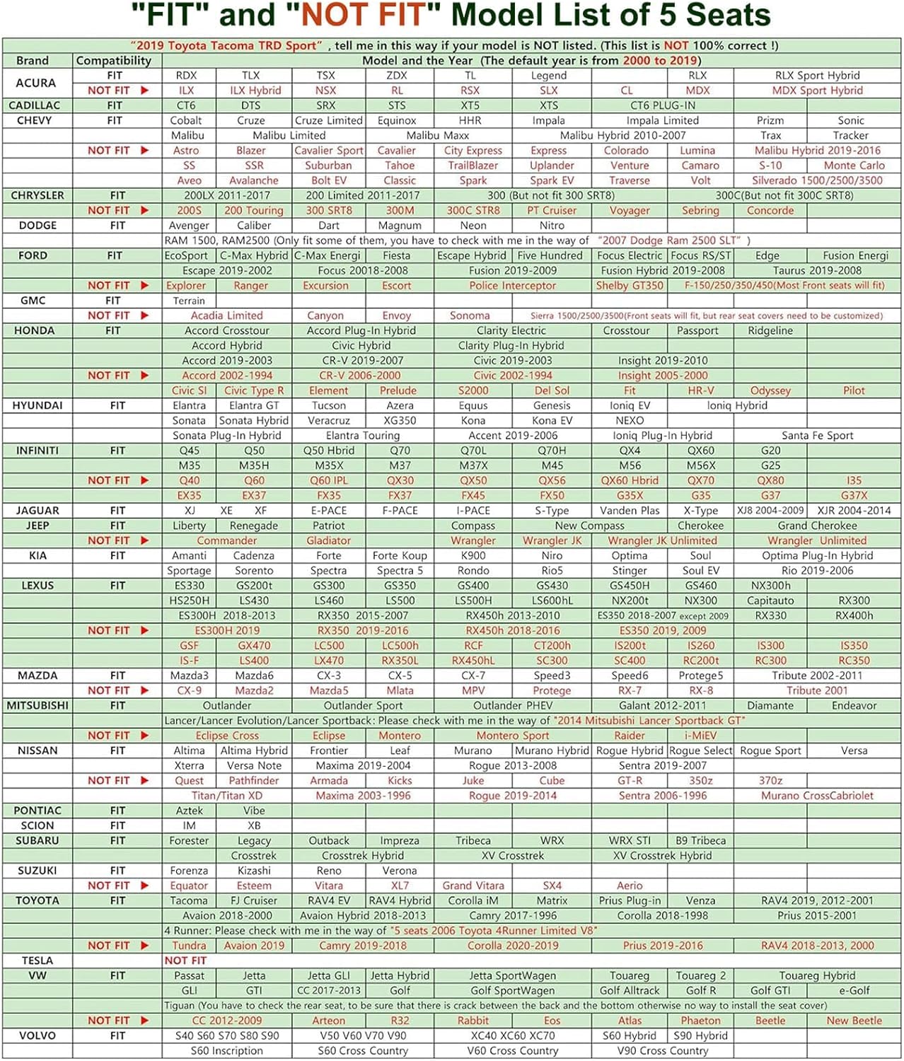 Fit for AUDI:A3,A4,A5,A8,Q5,Q7,S7/Fit for ACURA: RDX ,TLX ,TSX ,ZDX ,TL,Legend ,RIX,RLX Sport Hybrid/Fit for BMW:X1,X3,X5,3 Series,5 Series/Fit for CADILLAC:CT6 ,DTS ,SRX ,STS ,XT5 ,XTS ,CT6 PLUG-IN/Fit for CHEVY:Cobalt ,Cruze,Cruze Limited ,Equinox ,HHR ,lmpala ,lmpala Limited ,Prizm ,SonicFit for CHRYSLER:200Lx 2011-2017,200 limited 2011-2017,300 (But not Fit for 300 SRT8),300C(But not Fit for 300C SRT8)/Fit for DODGE:Avenger,Caliber,Dart,Maqnum,Neon,Nitro/Fit for FORD:EcoSport ,C-Max Hybrid,C-Max Energi,Focus 20018-2008,Escape Hybrid,Five Hundred ,Focus Electric,FocusRS,ST,Fiesta,Edge,Fusion Energi,Escape 2019-2002,Fusion 2019-2009,Fusion Hybrid 2019-2008,Taurus 2019-2008Fit for GMC:Terrain/Fit for HONDA:Accord Crosstour,Accord Plug-In Hybrid,Clarity Electric,Ridgeline,Crosstour,Passport,Accord Hybrid,Accord 2019-2003,Civic Hvbrid,CR-V 2019-2007,Insight 2019-2010,Clarity Plug-In Hybrid,Civic 2019-2003Fit for HYUNDAI:Elantra,Elantra GT,Sonata,Sonata Hybrid,Tucson,Veracruz,Azera,XG350, Equus,Kona,Genesis,Kona EV,loniq EV,NEXO,loniq Hybrid,Sonata Plug-In Hybrid,Elantra Touring,Accent 2019-2006,loniq Plug-In Hybrid,Santa Fe Sport/Fit for INFINITI:Q45,Q50,Q50 Hbrid,Q70,Q70L,Q70H,QX4,QX60,G20,M35,M35H,M35X,M37,M37X,M45,M56,M56X,G25Fit for JAGUAR:XJ,XE,XF,E-PACE,F-PACE,I-PACE,S-Type,Vanden Plas,X-Type,XJ8 2004-2009,XJR 2004-2014/Fit for JEEP:LibertyRenegade,Patriot,Compass,New Compass,Cherokee,Grand Cherokee/Fit for KIA:Amanti,Cadenza,Sportage,Sorento,NiroRio5,Optima,Stinger,OptimaPlug-In Hybrid,Forte,Forte Koup,K900,Soul,Spectra,Rondo,SouI EV,Spectra 5,Rio 2019-2006Fit for MAZDA:Mazda3,Mazda6CX-3,CX-5,CX-7,Speed3,Speed6,Protege5,Tribute 2002-2011/Fit for MITSUBISHI:Outlander,Outlander Sport,Outlander PHEV,Galant 2012-2011,Diamante,Endeavor/Fit for NISSAN:Altima ,Altima Hybrid,Frontier,Murano ,Murano Hybrid, Rogue Hybrid ,Rogue Select, Rogue Sport,Xterra,Versa Note,Versa,Maxima 2019-2004,Rogue 2013-2008,Sentra 2019-2007/Fit for PONTIAC:Aztek,VibeFit for SCION:IM,XB/Fit for SUBARU:Forester,Legacy,lmpreza,Crosstrek,Crosstrek Hybrid,Outback,Tribeca,XV Crosstrek,WRX,WRX STI,B9 Tribeca,XV Crosstrek Hybrid/Fit for SUZUKI:Forenza,Kizashi,Reno,Verona/Fit for TOYOTA:Tacoma,FJ Cruiser,RAV4 EV,RAV4 Hybrid,Corolla iM,Avaion 2018-2000,Camry 2017-1996,Avaion Hybrid 2018-2013,Matrix,Corolla 2018-1998,Venza,RAV4 2019,2012-2001,Prius 2015-2001Fit for VW:Passat,Jetta,Jetta GLl ,Jetta Hybrid,Jetta SportWagen,Touareg,Touareg 2,Touareg Hybrid,GLL,GTI,CC 2017-2013,Golf,Golf SportWagen,Golf Alltrack,Golf R,Golf GTl,e-Golf/Fit for VOLVO:S40,S60,S70,S80,S90,V50,V60,V70,V90,XC40,XC60,XC70,S60 Hybrid ,s90 Hybrid,S60 Inscription,S60 Cross Country,V60 Cross Country,V90 Cross Country