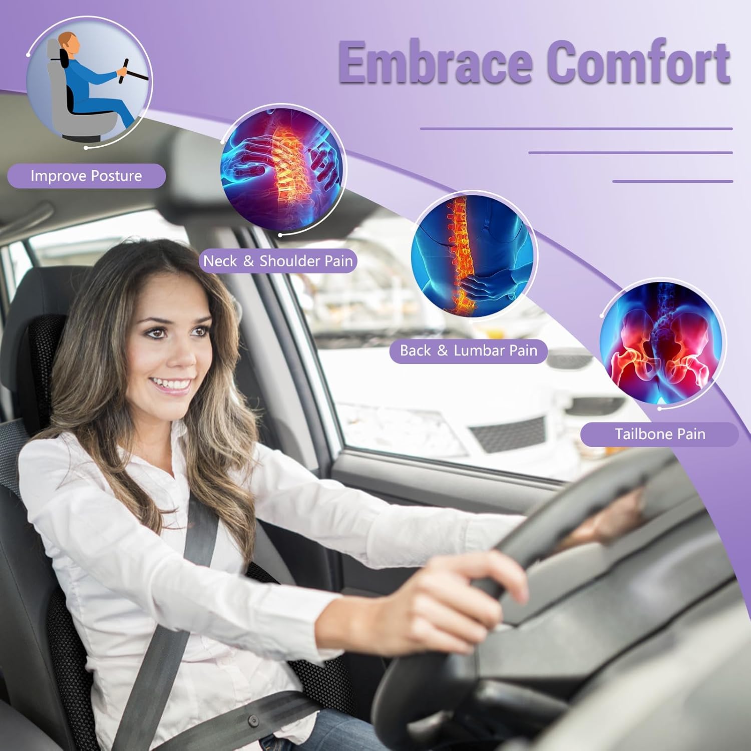 100% Memory Foam: The seat cushion, lumbar support pillow and neck pillow set made of 100% memory foam, cleverly combines stable support with flexible elasticity, ensuring excellent resilience and shape retention after long-term use without deformation or collapse. Pillow set effectively relieves pain, distributes weight evenly, and provides lasting comfortable support.