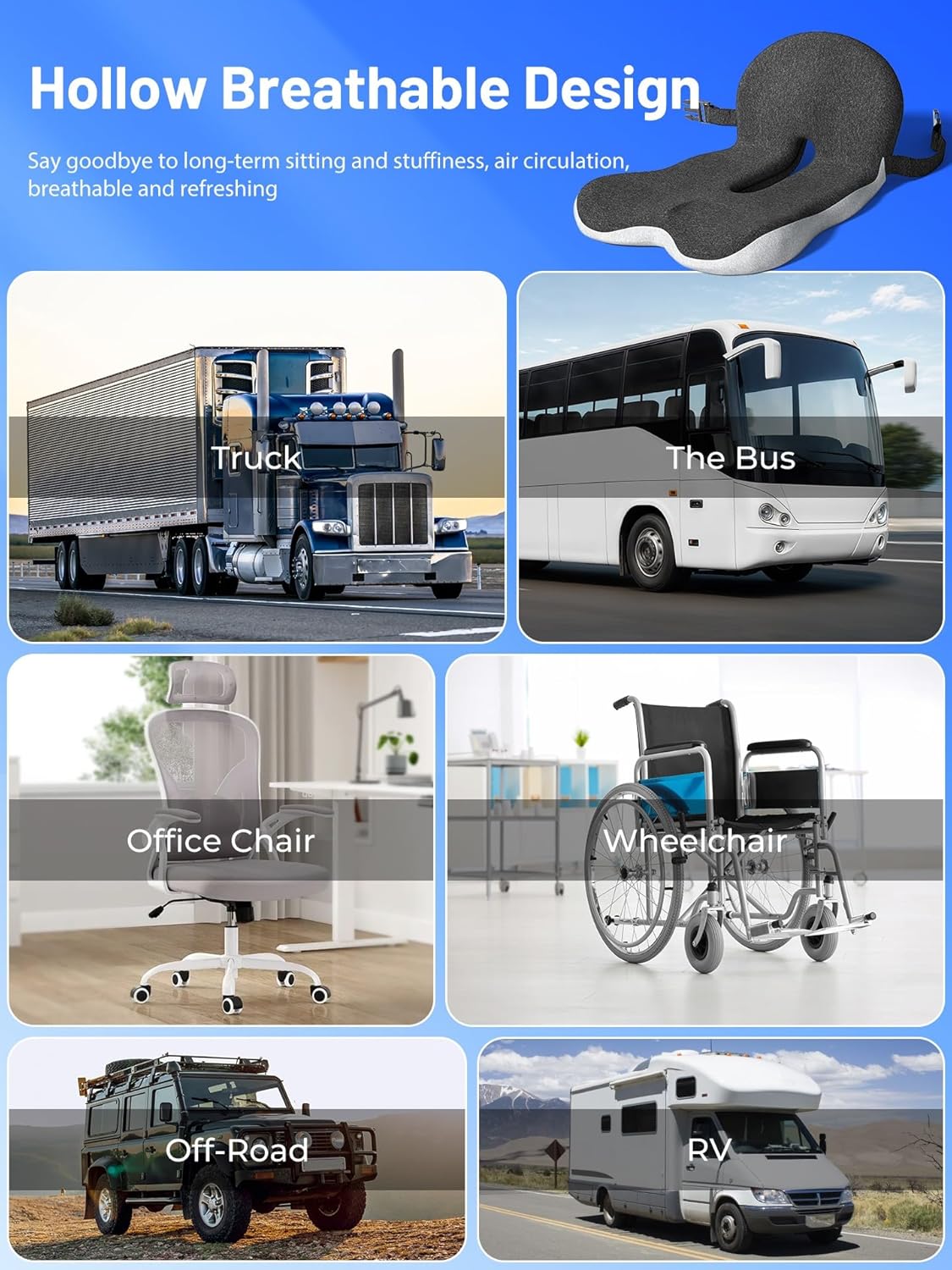 I ordered this car seat cushion for my RV camper van. I am in the process of selling my home and moving into Van Life full time. I will be driving sometimes hundreds of miles a day and wanted something more conforming and comfortable to sit on for long drives. I am someone who suffers from degenerative disc disease, and back & hip pain, and this seat really helps take pressure off my pain points, while still providing firmness and support.I like how the seat has a band that will stretch and wrap around my driver seat to help hold it in place. It really does make driving more comfortable and I have since ordered a second one for the passenger seat.