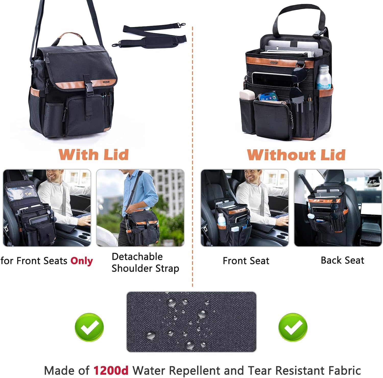 ✅ Ultra-Stable Design – Two Versions for Flexibility Style A: Without Lid – Fits both front & back seats. Adjustable top straps keep it secure while driving, preventing slipping or tipping without blocking passengers. Style B: With Lid – Keeps items concealed, dust-free, and private. Ideal for front seat use; includes detachable strap for shoulder carry.