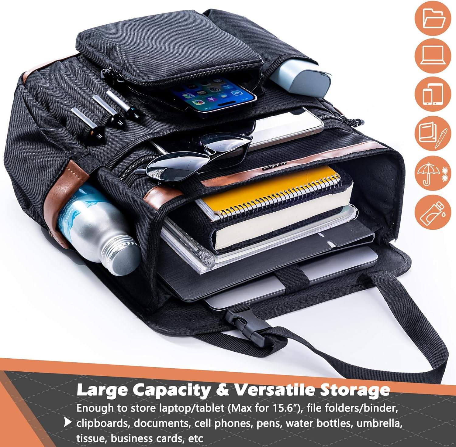 ✔ Laptop & Large Storage Capacity – Spacious main compartment with a padded 15.6” laptop/tablet sleeve plus room for large 3-ring binders, documents, or books, making it the perfect mobile office bag.