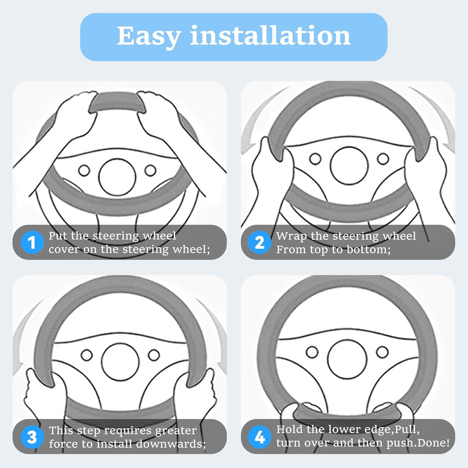 【Easy to Install】: The PU leather steering wheel cover is designed without inner ring, and the installation is flexible and convenient. Just cover it on the steering wheel, grab both sides with both hands and pull to the bottom until it is completely fitted, and then rotate to adjust the position.