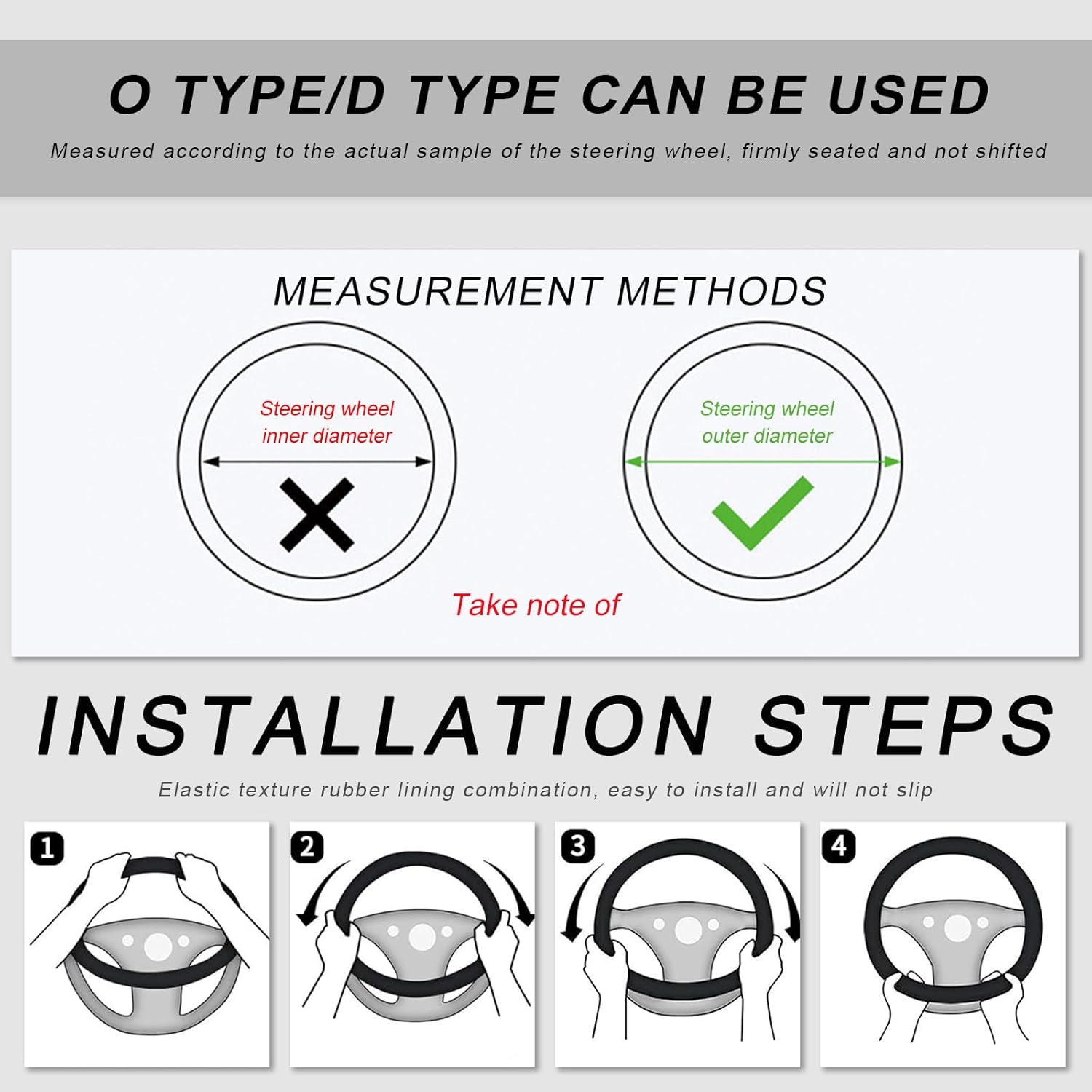 -The installation process is straightforward. Simply place the top of the cover on the steering wheel and press it down, gradually pulling it tightly to any side on the lower part.