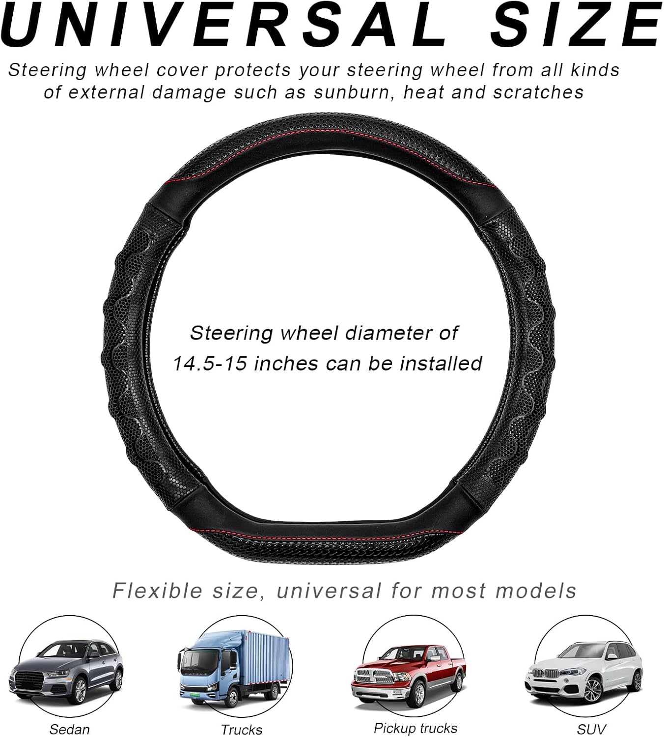 Broad Application: This wheel wrap cover is specifically designed to fit steering wheels with diameters between 14.5 and 15 inches. As a result, it offers a universal fit for a wide range of vehicles, including cars, trucks, campers, and SUVs, enhancing both aesthetic appeal and functionality