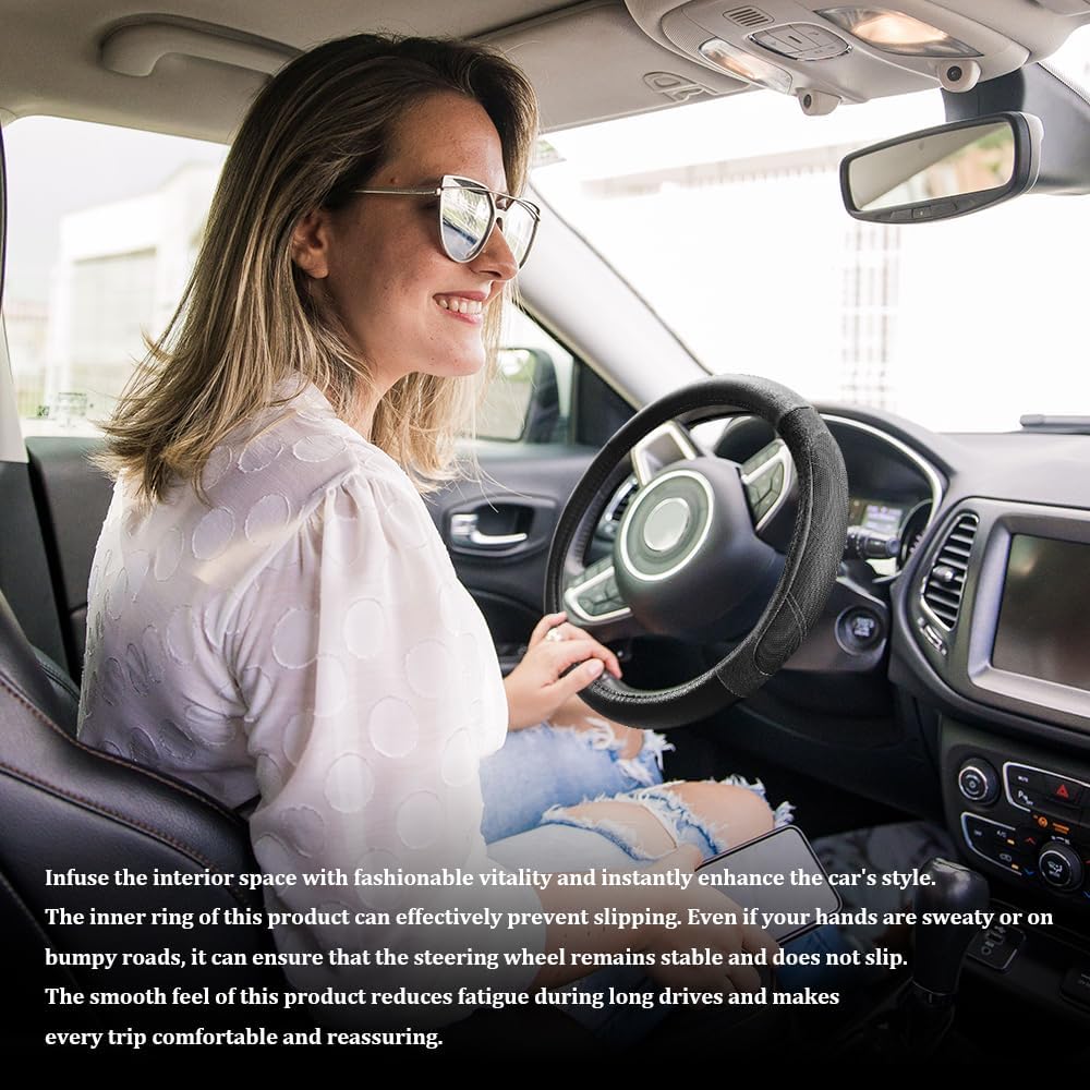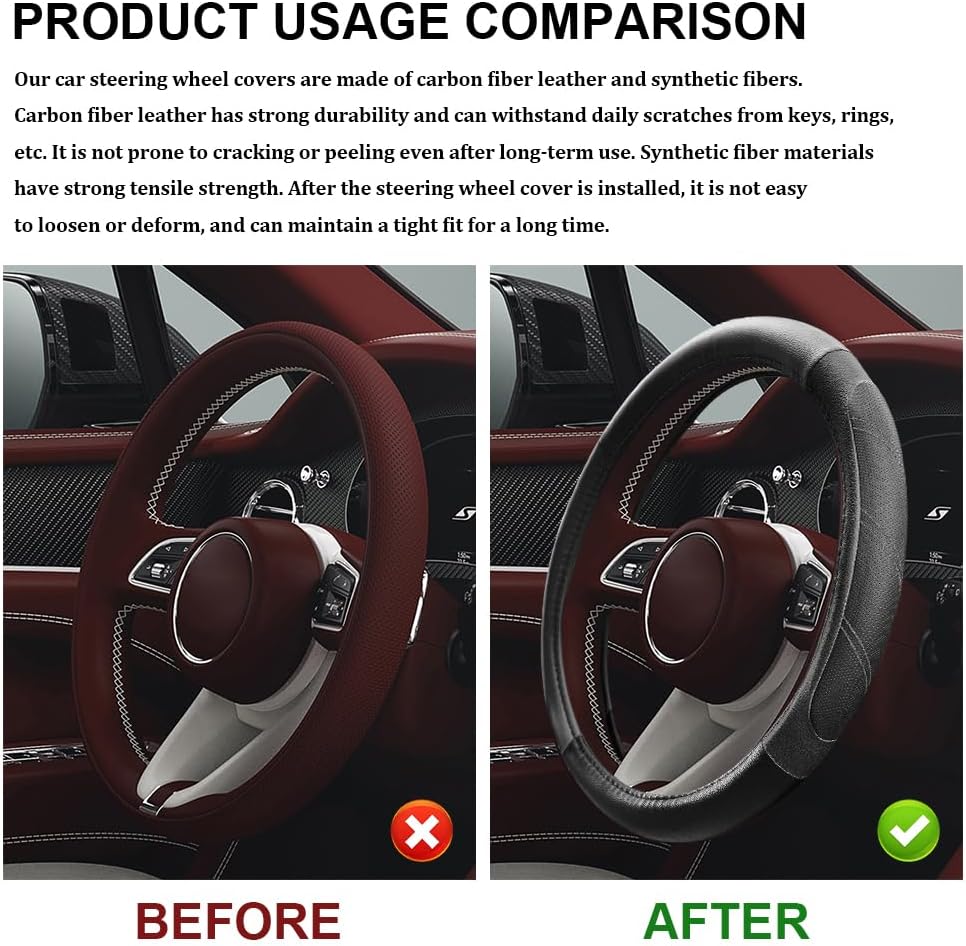 Material: Our car steering wheel covers are made of carbon fiber leather and synthetic fibers, with double-thread sewing reinforcement. They are anti-slip, wear-resistant, and have good breathability. They are not prone to loosening or deformation even after long-term use