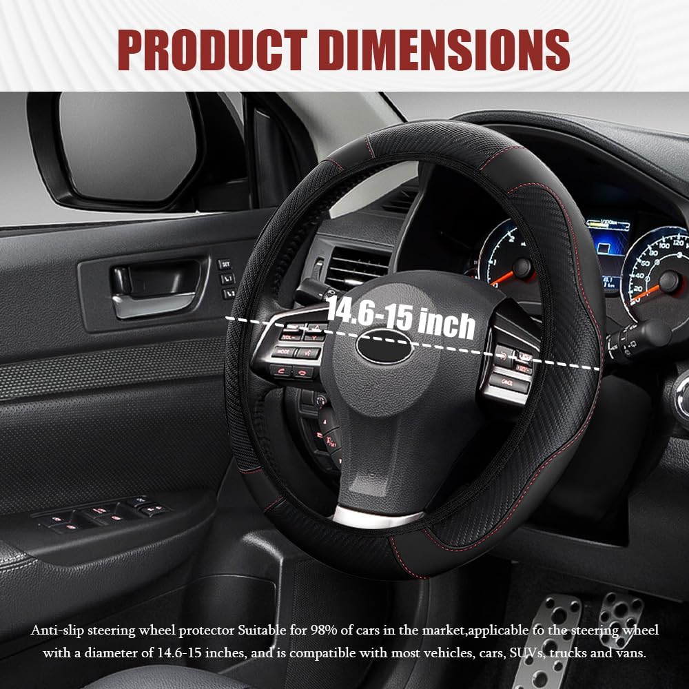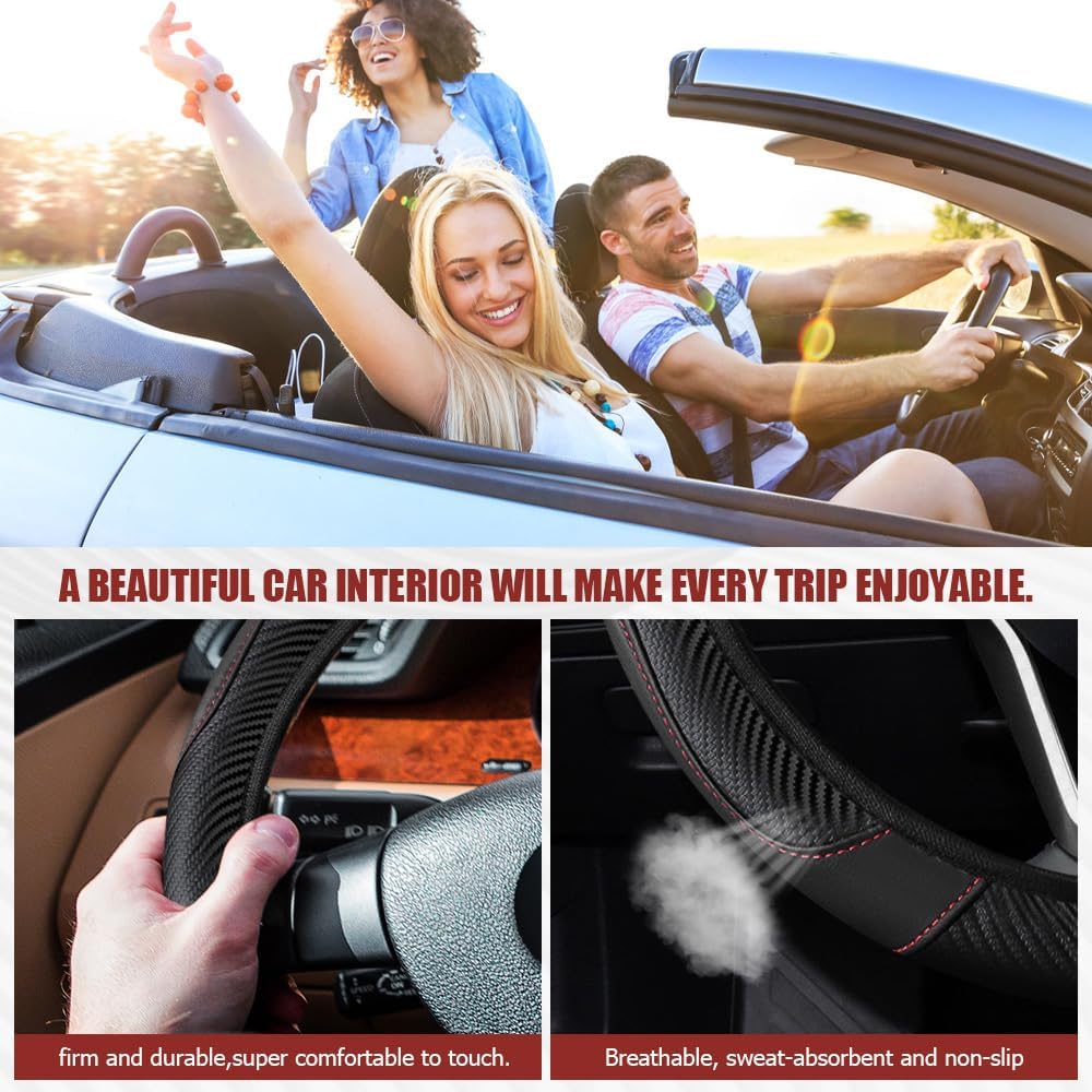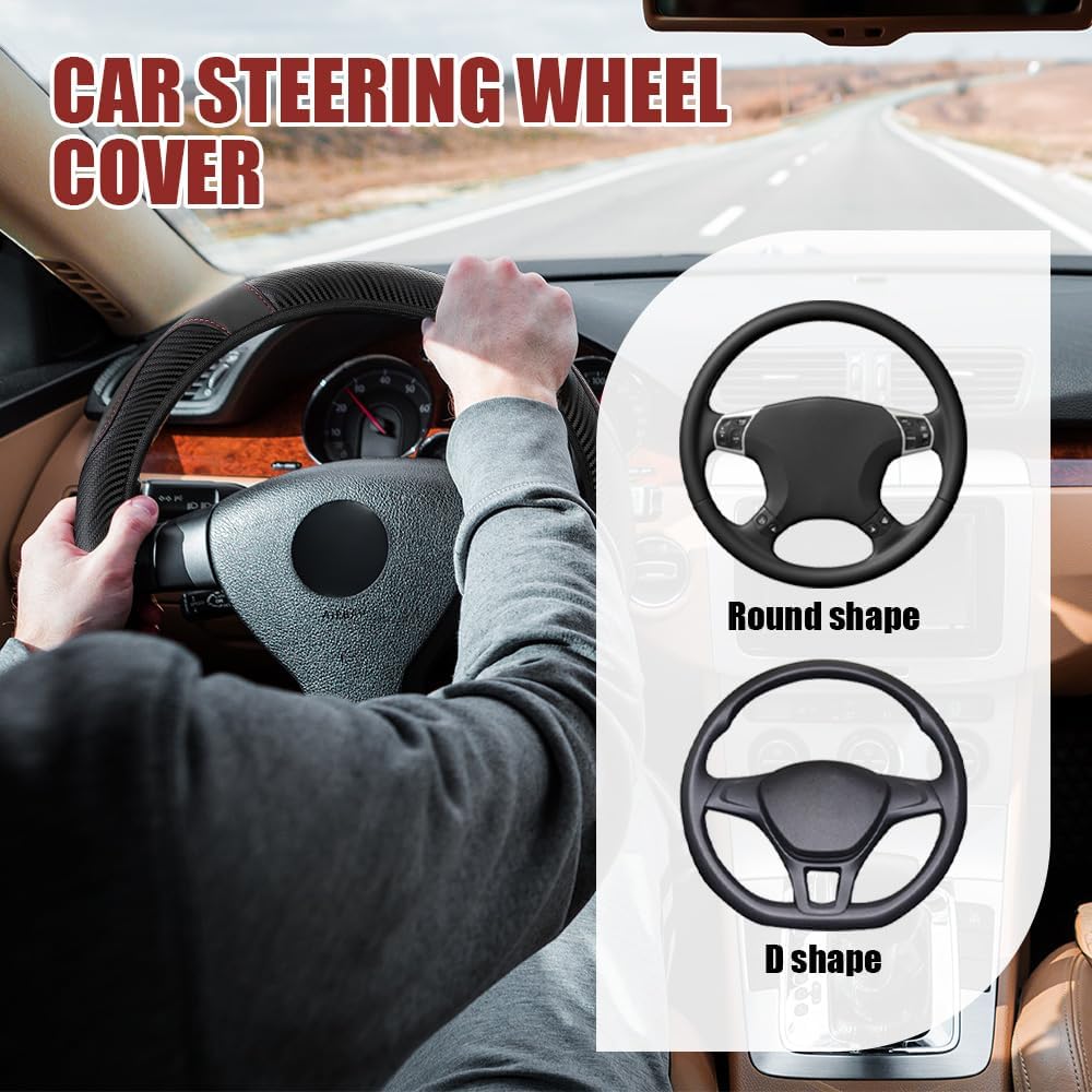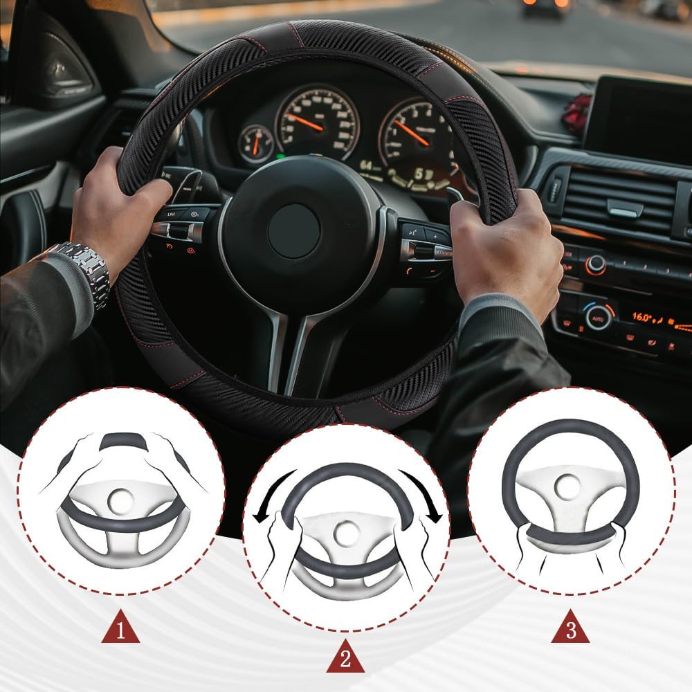 [Durable material] : The steering wheel cover for car is made of carbon fiber leather material, which has the characteristics of feel comfortable, scratch resistant, non-slip thin, breathable and not stifling sweat, easy to clean, long service life