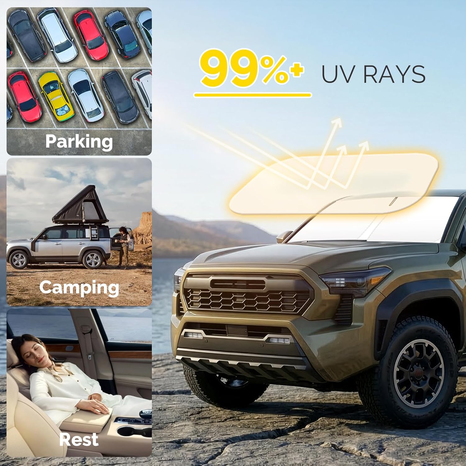 🚗【Easy Installation】This 2016-2023 2024 2025 2026 toyota tacoma accessories tacoma windshield visor sun shade can be easily fixed in your car without any tools. Unfold the tacoma sun shade windshield and place it in front of the windshield inside the car, and fix it with the car sun visor.